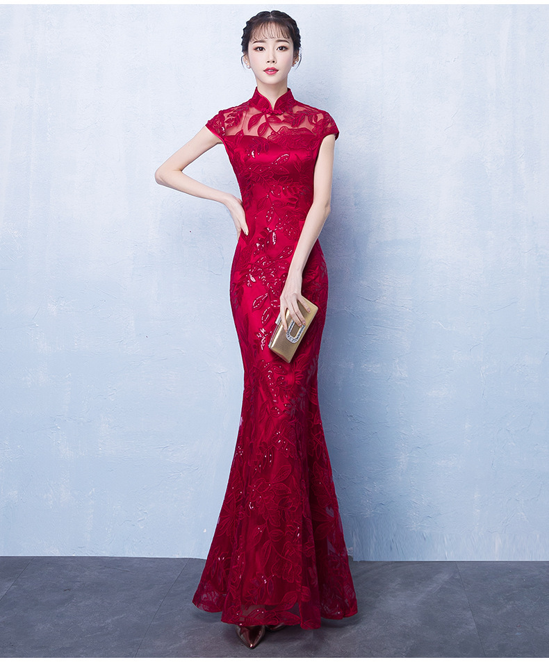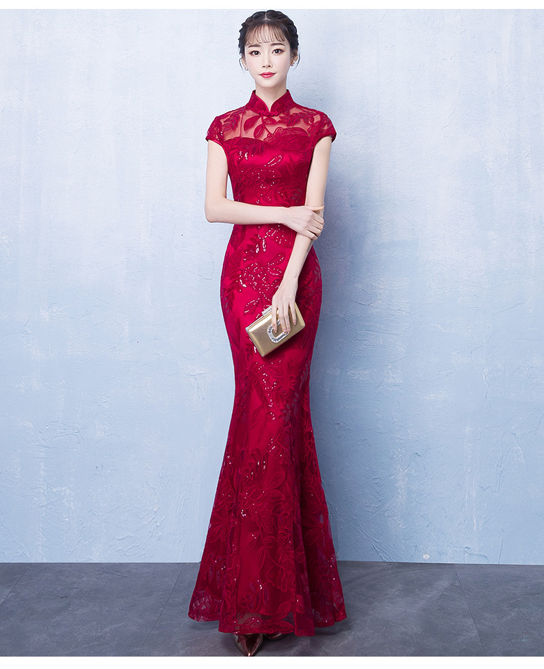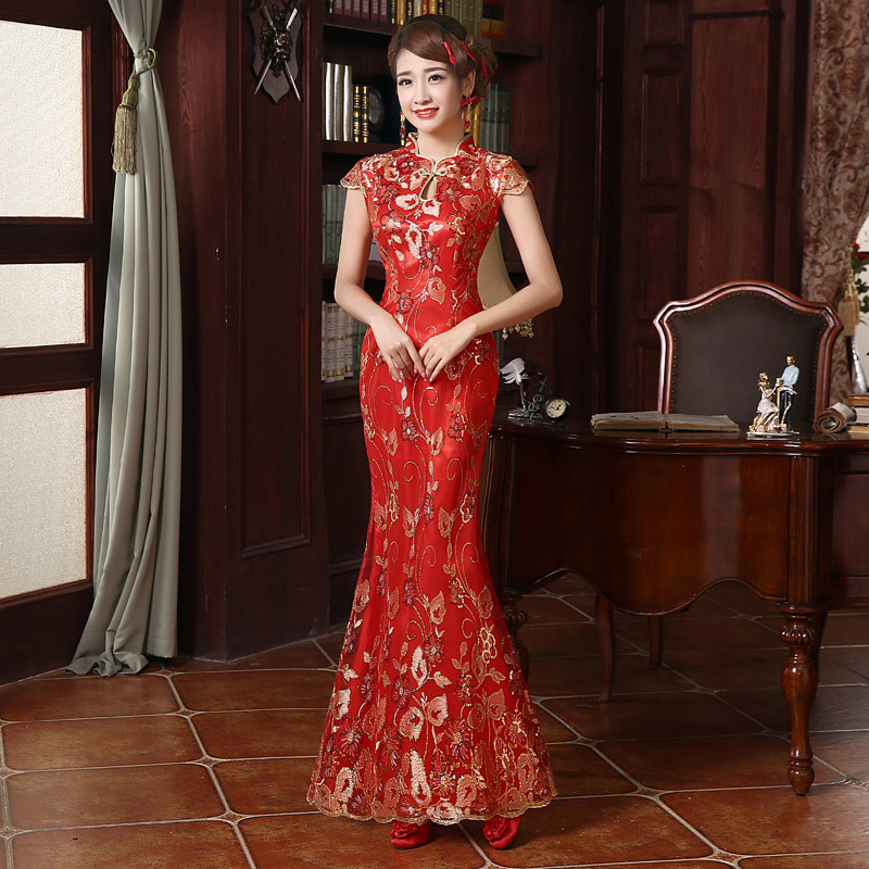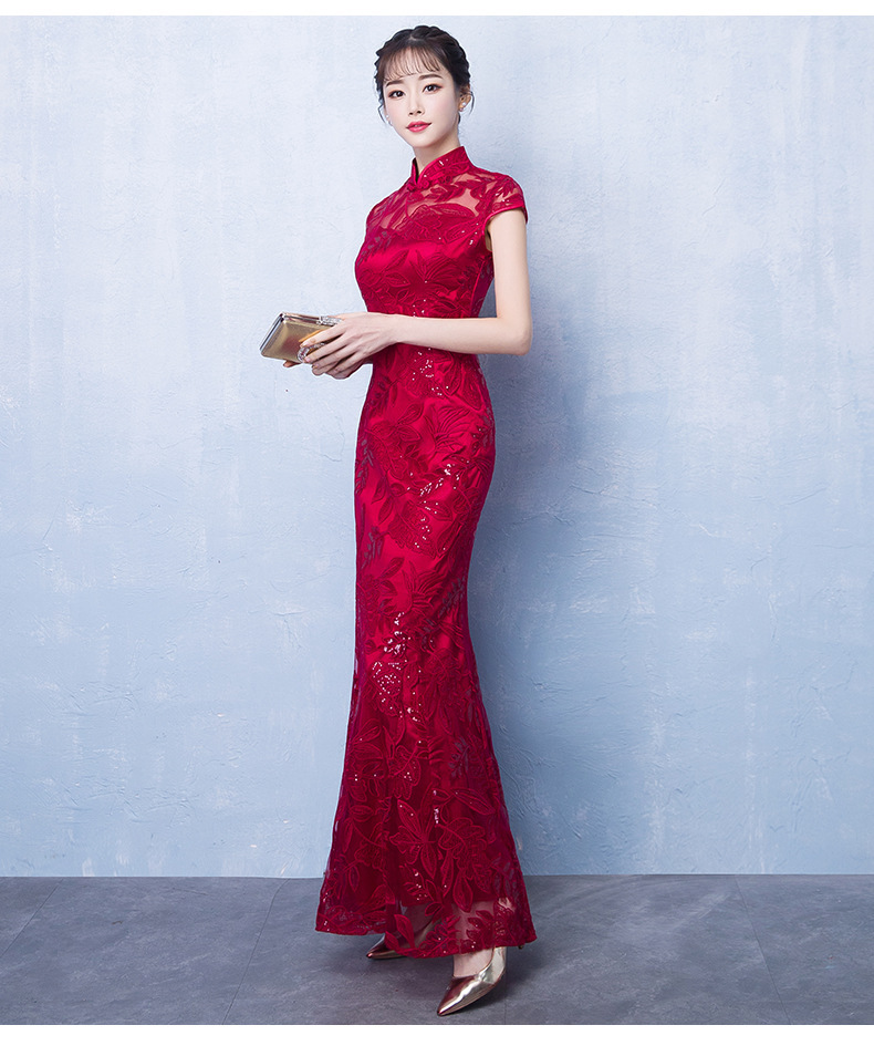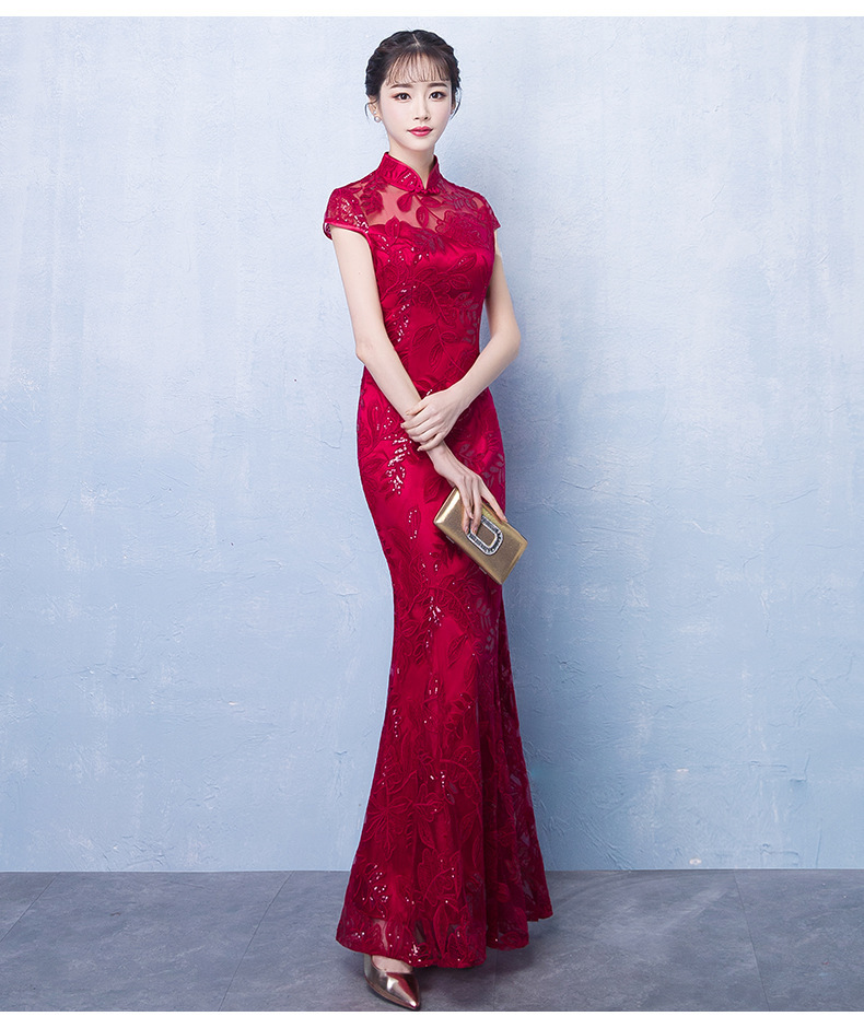 2025年新作赤いロングトーストドレス、花嫁用レトロ改良型スリムフィットチャイナドレス、フィッシュテールウェディングドレス、夏