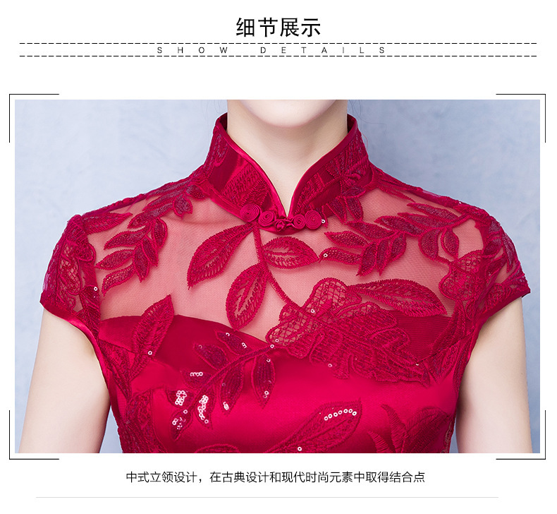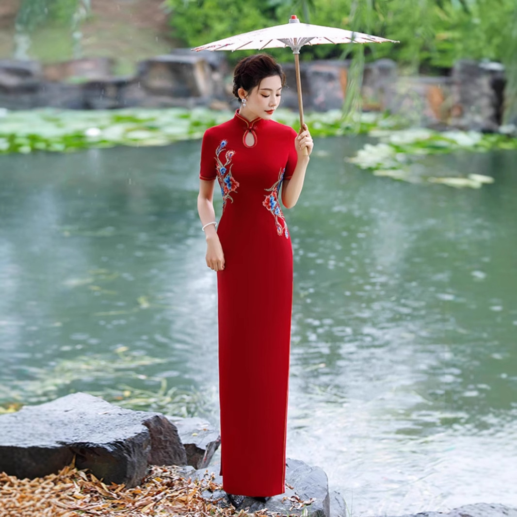 改良型旗袍風パフォーマンスドレス 女性用 春秋 ロング丈 スタンドカラー 細見え おしゃれ 刺繍入り 宴会 イブニングドレス
