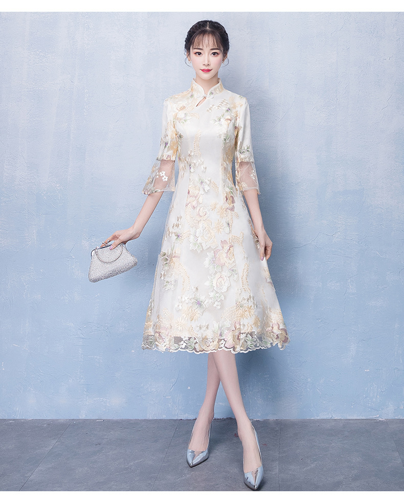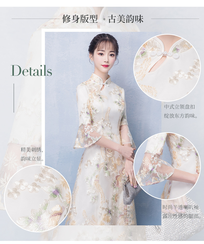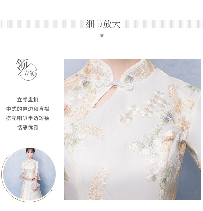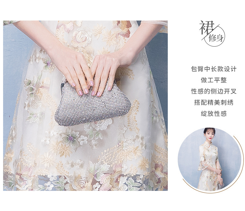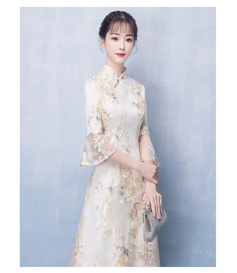 改良型旗袍風パフォーマンスドレス 女性用 春秋 ロング丈 スタンドカラー 細見え おしゃれ 刺繍入り 宴会 イブニングドレス