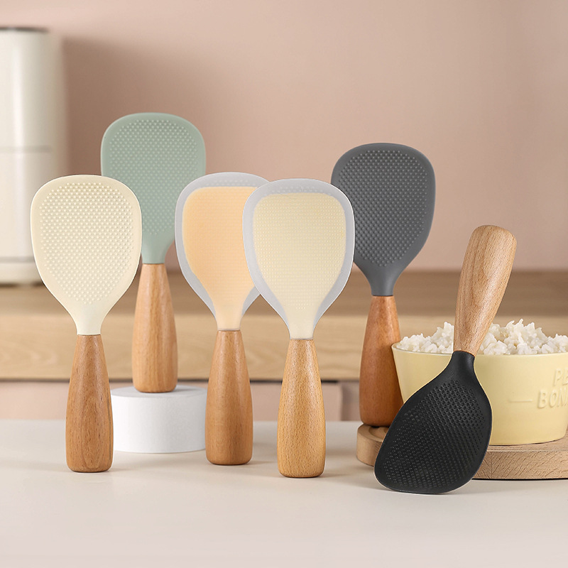 2025年新型木柄シリコン製しゃもじ、炊飯器用しゃもじ、自立式シリコン製ノンスティックしゃもじ、米用美式しゃもじ