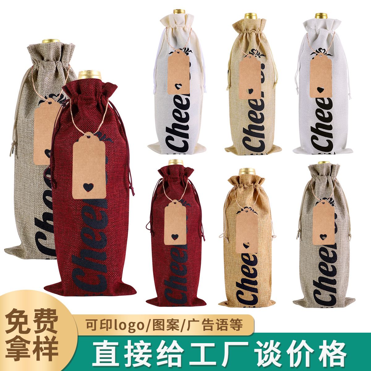 套装规格:麻布酒袋12pc+爱心卡片吊牌12pc+10米麻绳