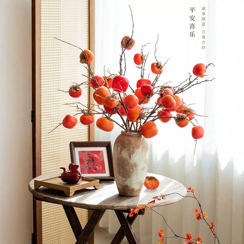 模造柿の実6個付き枝、模造果物飾り、リビングテーブル飾り、新年飾り、造花