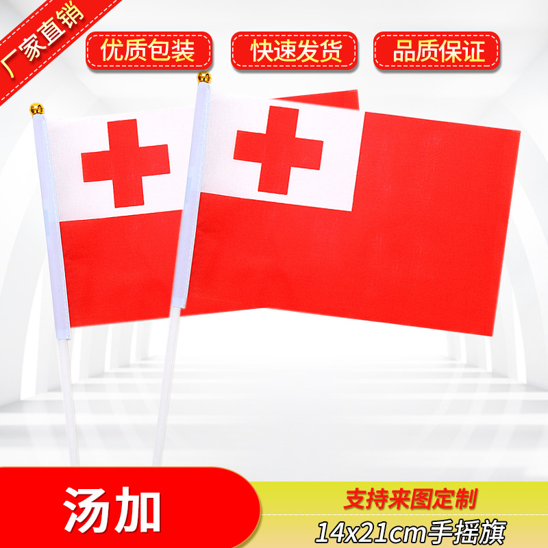 8号14*21厘米 汤加 手摇旗 配30厘米塑料杆子 直径6毫米 本店还有其它国家手摇旗 都有现货 也可以定做LOGO 具体咨询客服