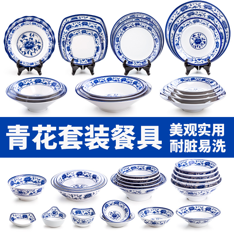 メラミンは磁器の青花磁器の食器の円盤の野菜の皿の平皿の角皿の小さい碗のラーメンの碗をまねて料理の碗の酸っぱい魚の大きい碗を作ります。