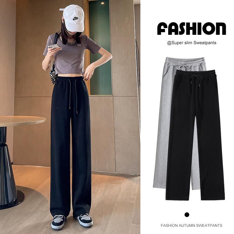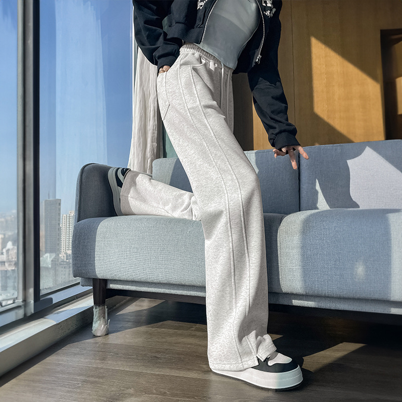 グレーのストレートワイドパンツ レディース 2025年秋冬新作 小柄さん向け ゆったりスタイル 細身バージョン 裏起毛 カジュアルスウェットパンツ