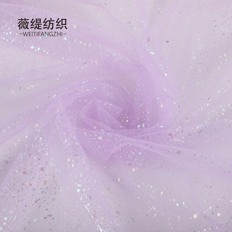 【产品特点】布料底纱为锦纶加密美国网,纱质柔软细腻,不易脱丝。纱的上面烫上荧光彩色点点,点点不易脱落,炫彩美丽,闪亮大方。