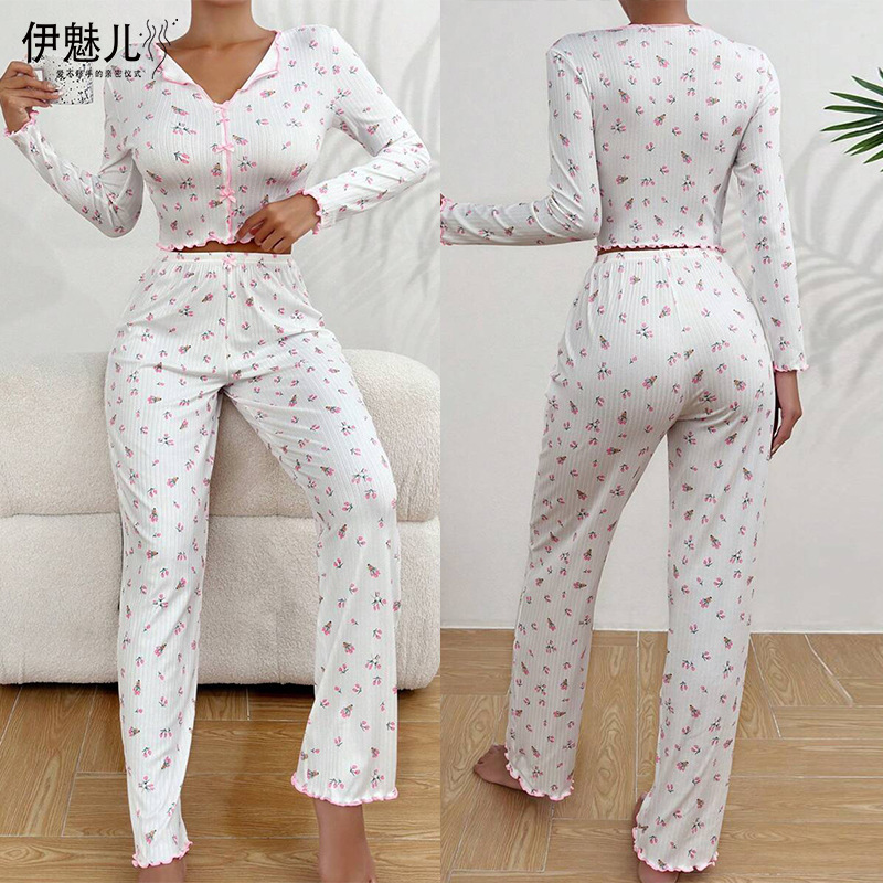 欧米の国境を越えて人気のある家庭服の蝶結びの襟をめくって長袖のパジャマの女性はズボンの2つのセットを着ることができます。