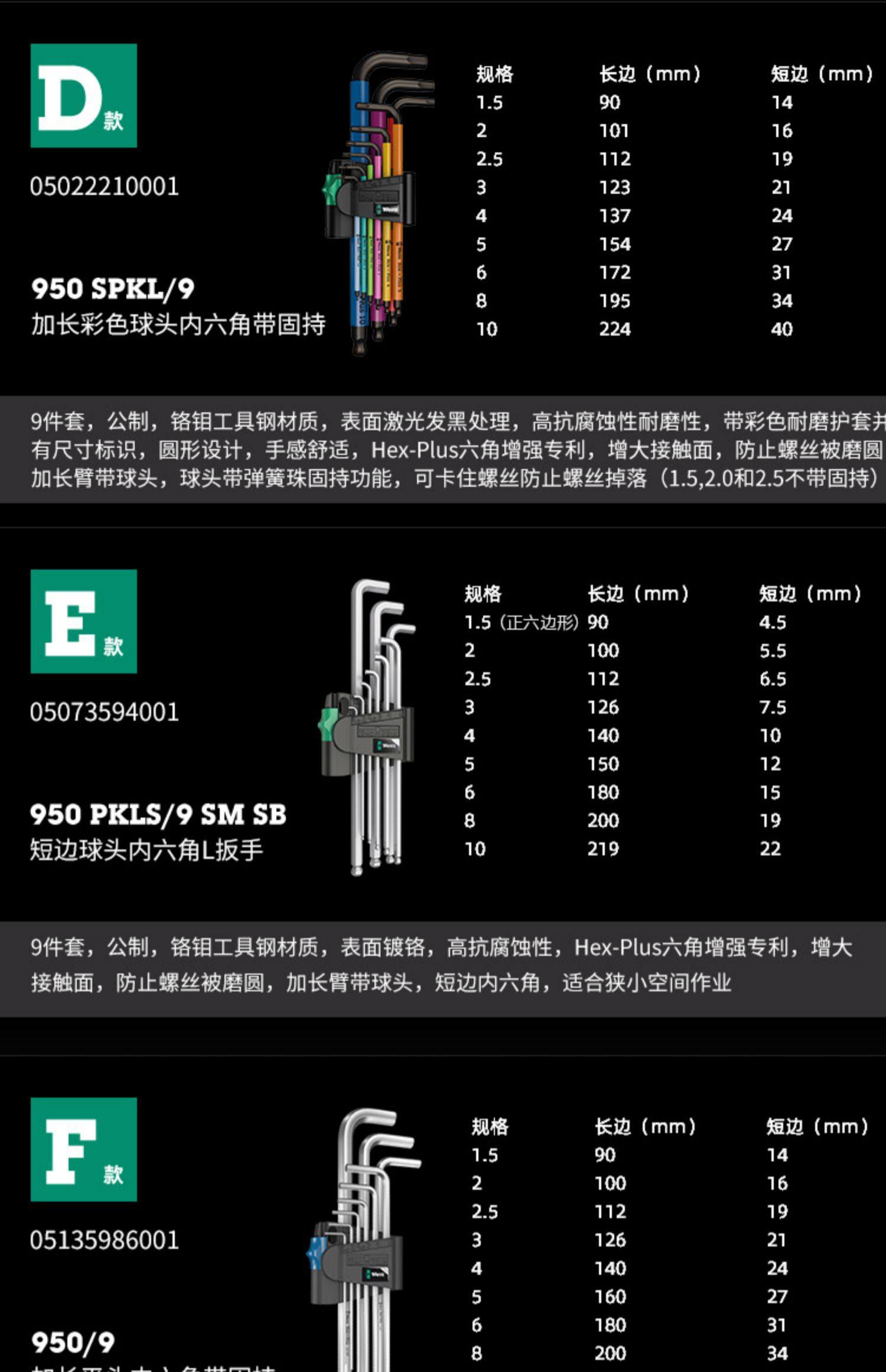 Weraヴィラ六角レンチセット輸入950延長ボール六方梅Lレンチドイツ工業級