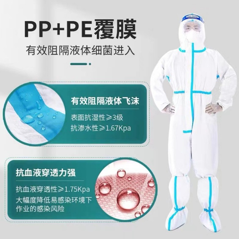 上海現貨使い捨て不織布隔離服、フィルムコーティング、厚手、防塵、サンプル生産可能、逆着用保護服