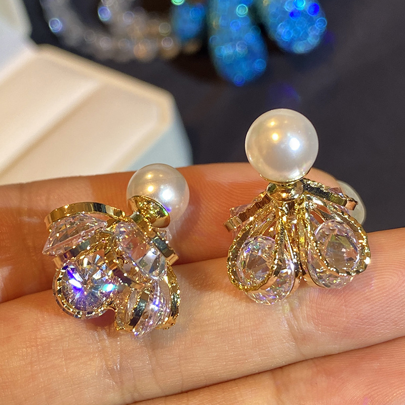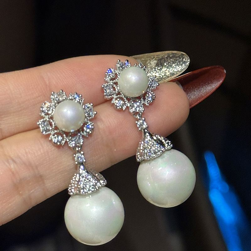 轻奢气质优雅高级感花朵锆石镶嵌圆珠珍珠圆形吊坠甜美百搭耳环