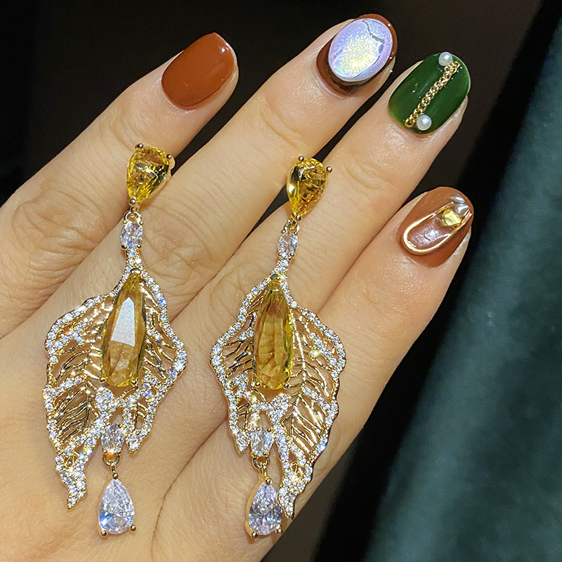 高級感の軽い豪華な不規則な葉の水滴の長いタイプのジルコンのイヤリングの葉の黄色の水晶のドレスは宴会を演出します。