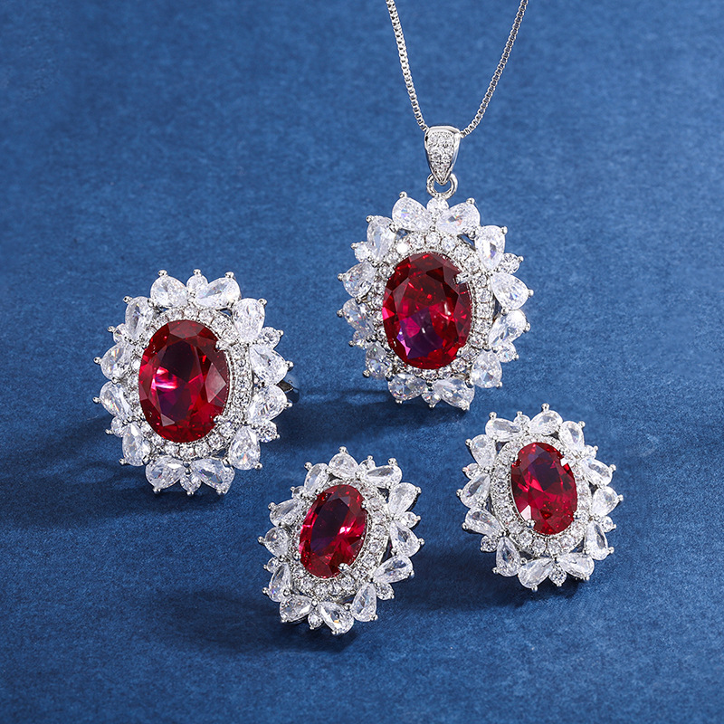 庄生ジュエリー欧米復古風シミュレーション赤コランダムジュエリーセットペンダント指輪12*16ピアス8*12