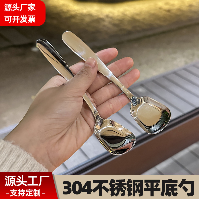 304不锈钢平底勺家用吃饭汤勺中式调羹通用甜品雪糕勺方头勺批发
