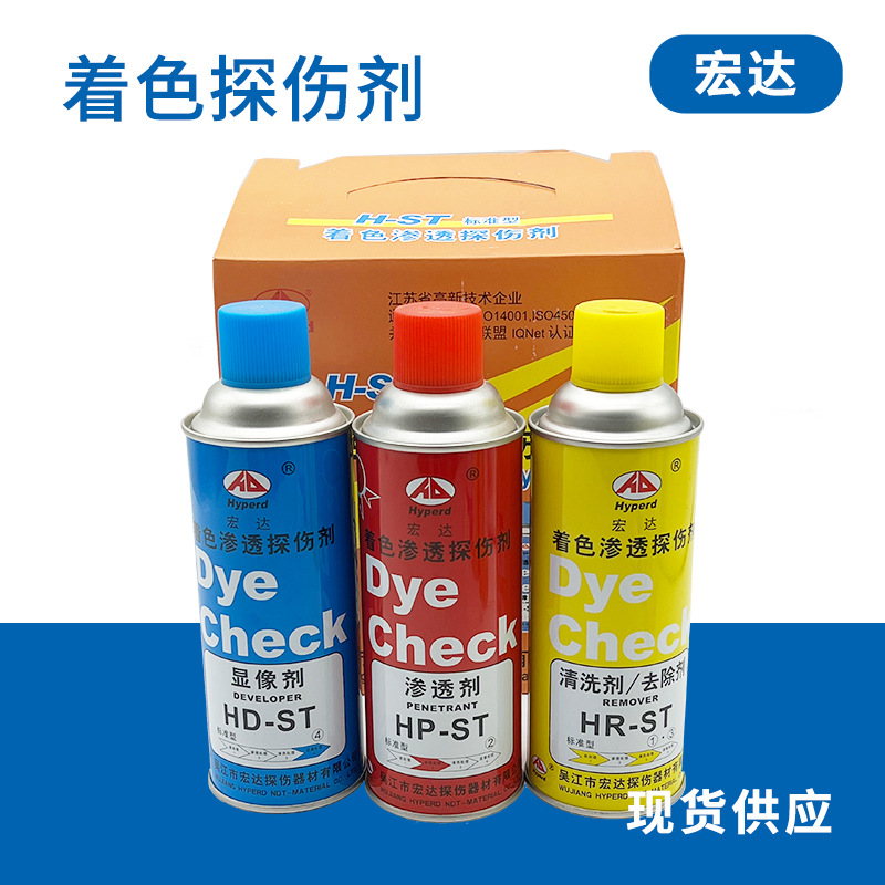 着色渗透探伤剂是一种表面无损检测方法,属于无损检测五大常规方法之一。渗透检测方法,即在测试材料表面使用一种液态染料,并使其在体表保留至预设时限,该染料可为在正常光照下即能辨认的有色液体,也可为需要特殊光照方可显现的黄/绿荧光色液体。此液态染料由于“毛细作用”进入材料表面开口的裂痕。毛细作用在染色剂停留过程中始终发生,直至多余染料完全被清洗。此时将某种显像剂施加到被检材质表面,渗透入裂痕并使其着色,进而显现。具备相应资质的检测人员可对该显现痕迹进行解析。