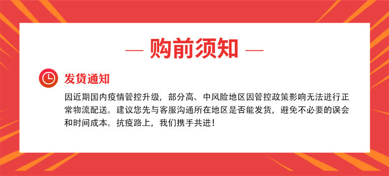 请认真阅读以上内容,这对您非常重要,如您无法做到上述动作,对产生的问题我们将非常抱歉,我们也无能为力。此条款自订货之时起生效,如有异议,请与我司工作人员确认后再订货。
