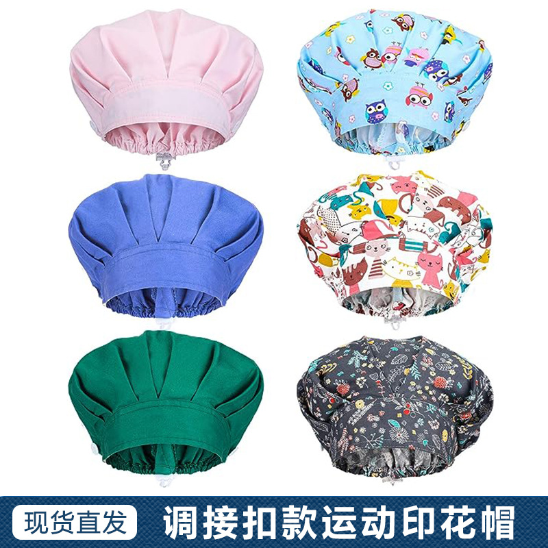 蓬蓬帽調節ボタンプリント純綿手術帽シェフ帽女性キッチン油煙防止飲食作業帽子防塵