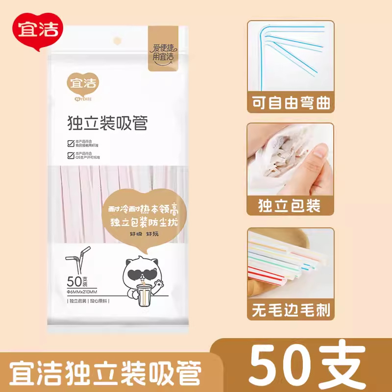 宜潔プラスチック曲げ可能なストレート伸縮ストロー飲料ジュース独立包装使い捨てストロー50匹Y-9912