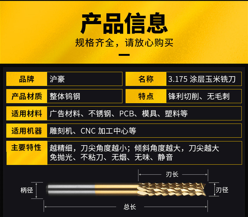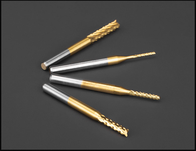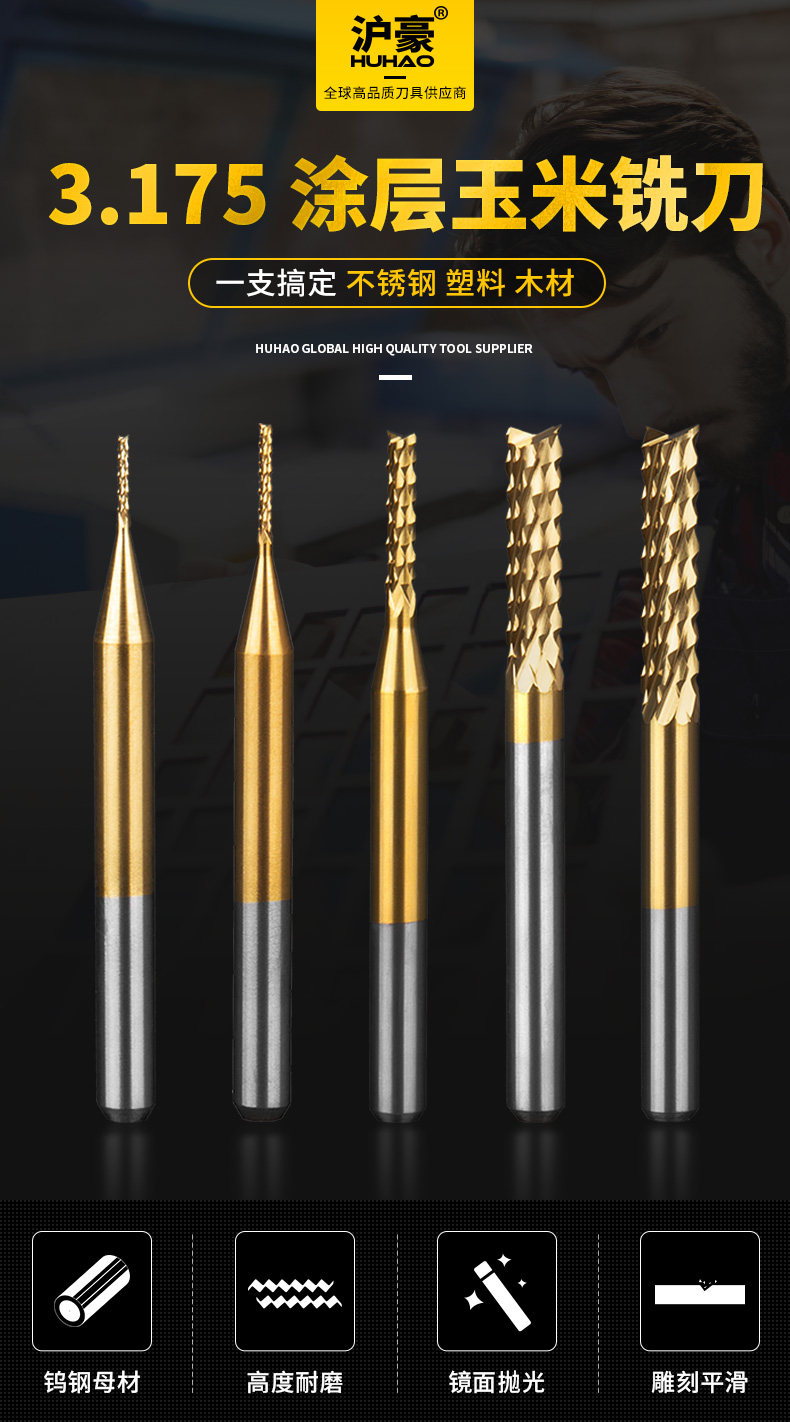 上海豪3.175トウモロコシフライスタングステン鋼tinコーティングpcbフライス回路基板粗皮トウモロコシ電気木材フライス