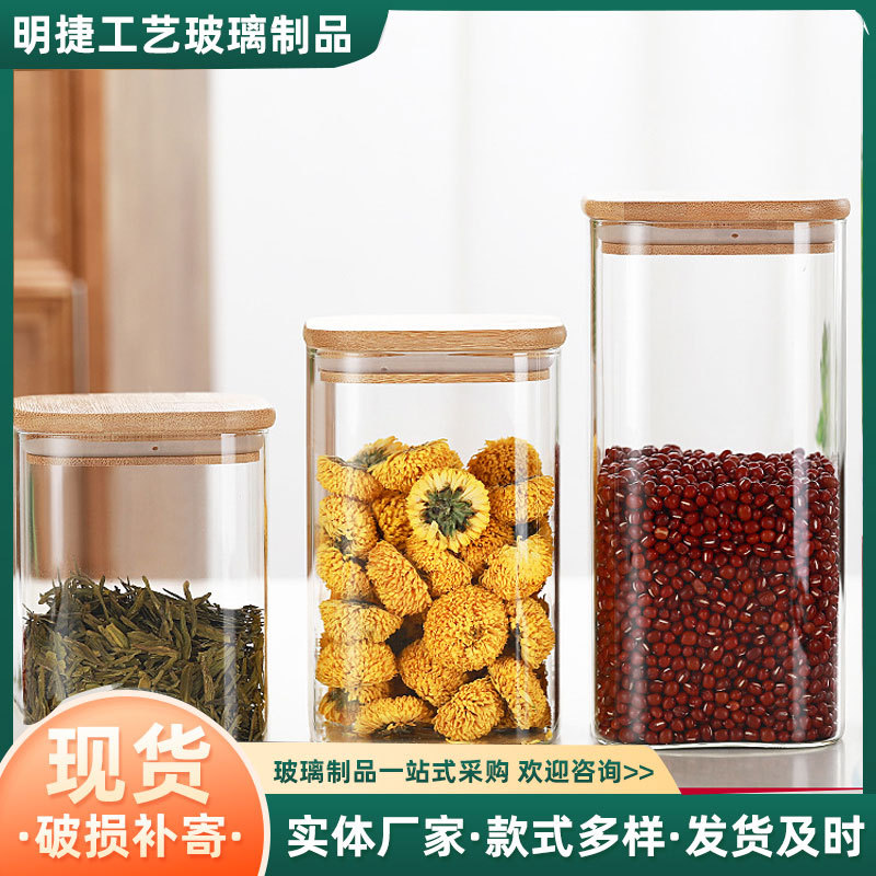 直筒角型密封缶透明竹蓋茶葉缶厨房雑穀貯蔵缶高ホウ素シリコンガラス密封缶
