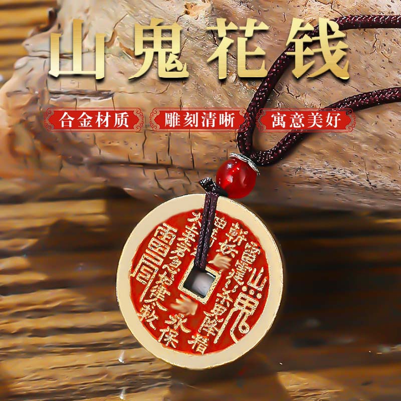 老山鬼はお金を使って古ペンダントに似せて八卦の朱砂の銅銭を飾って無事に男女のネックレスの本命のお守りを掛けます。