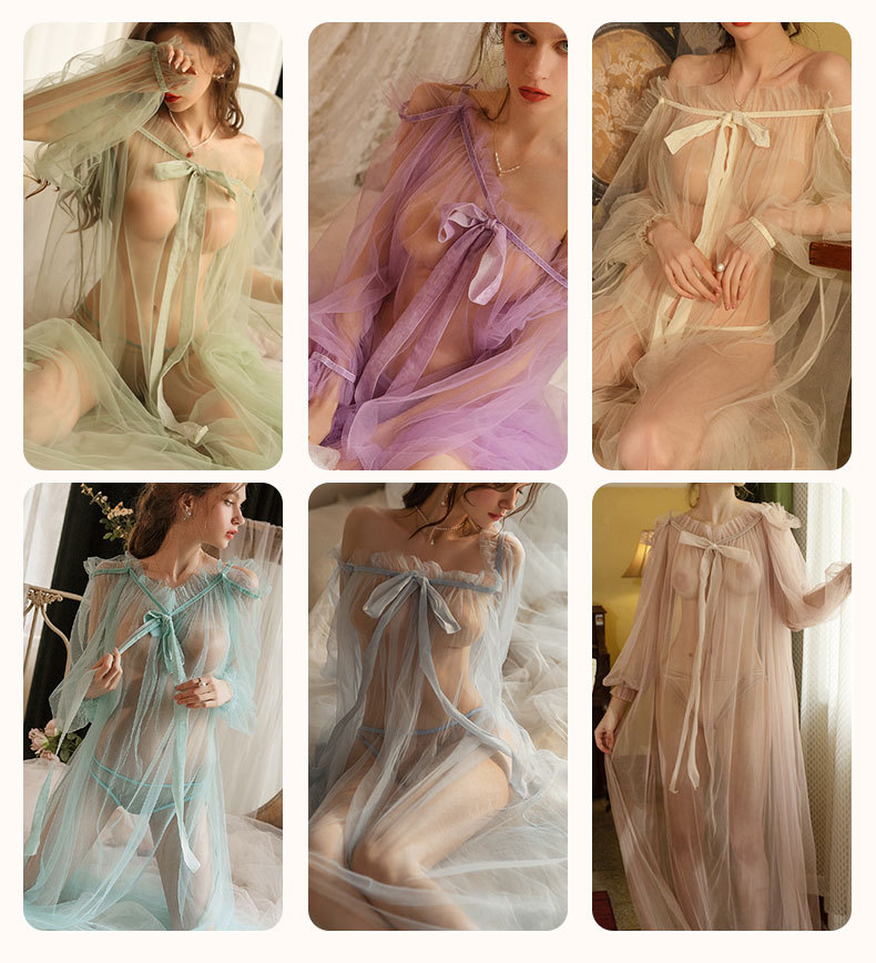 国境を越えた貿易プラスサイズの女性用セクシーなメッシュパジャマ、純粋な欲望スタイルのセクシーなロングシースルーブラウス、レースのナイトガウン、トレンディ