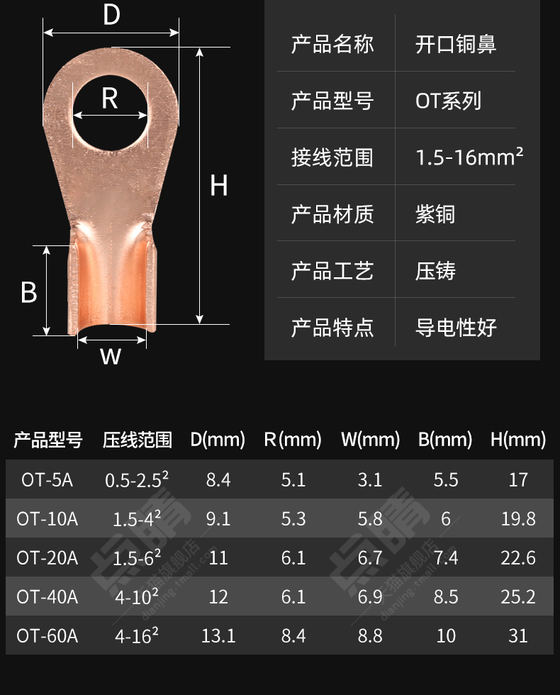 Ot紫銅開口鼻電線配線端子銅継手線耳5 10 20 60aセット80本