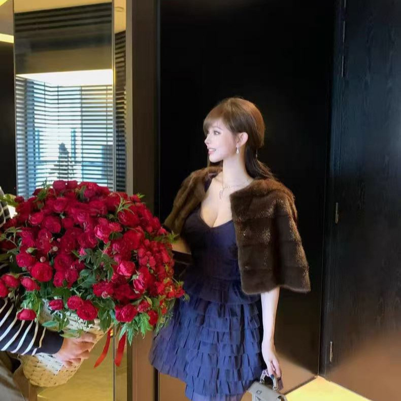 圣诞披肩淡蓝纯白荷叶斗篷氛围感环保毛皮草外套穿搭