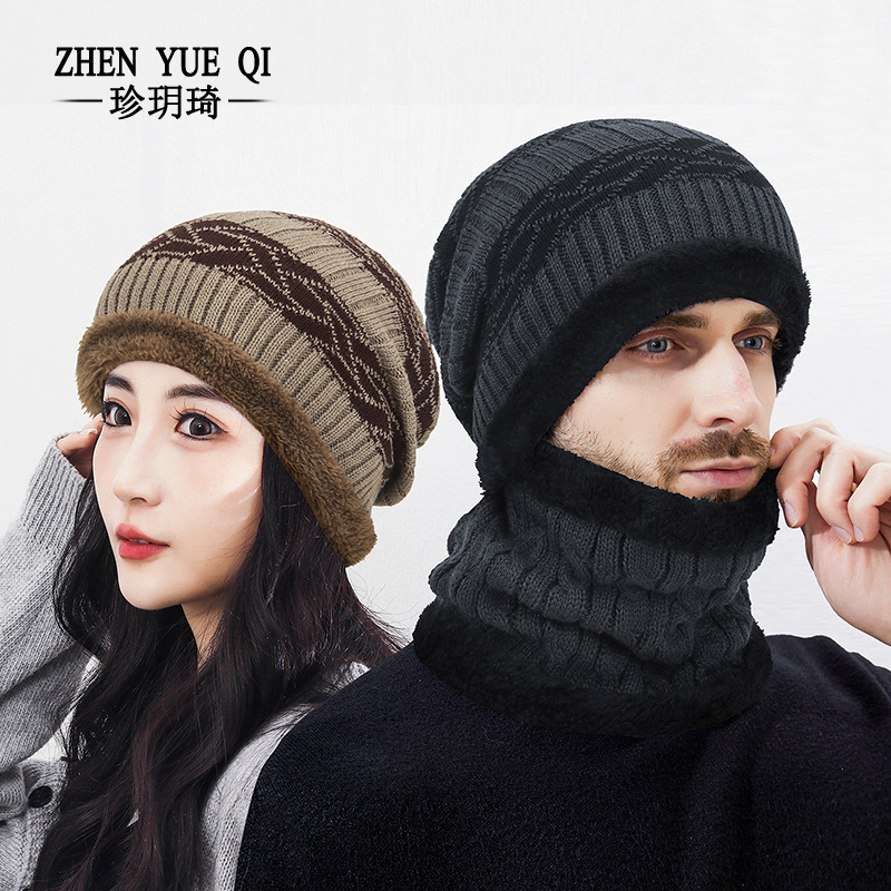 秋冬ニット毛糸帽子マフラー男女ベルベット厚手帽子マフラーセット保温耳保護自転車