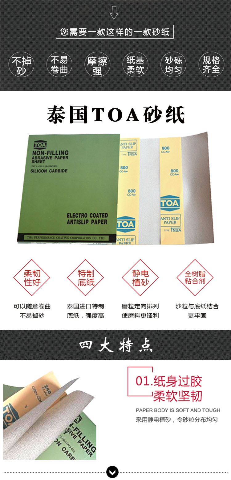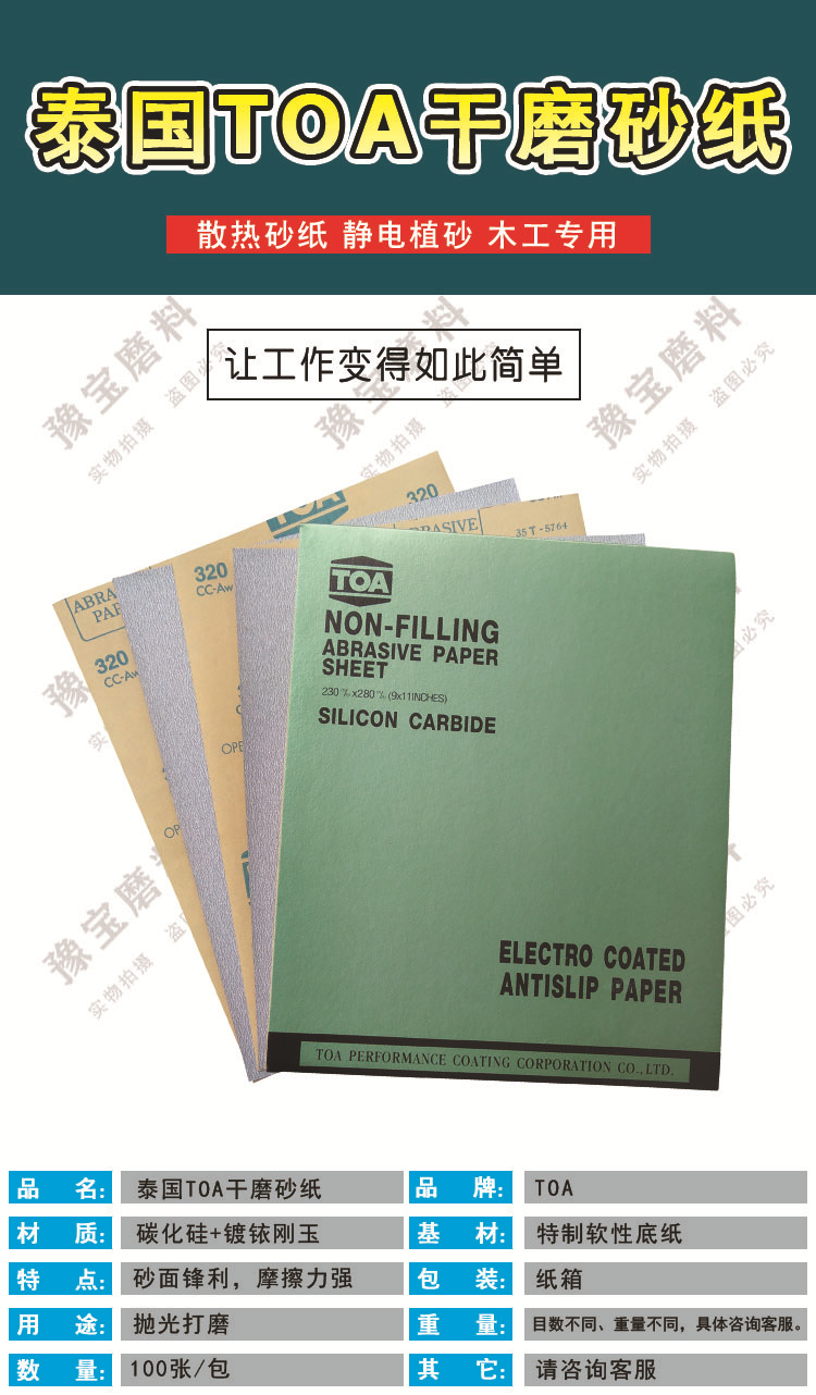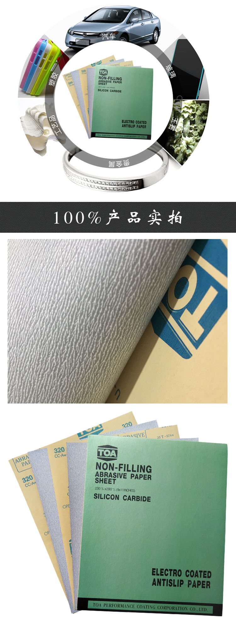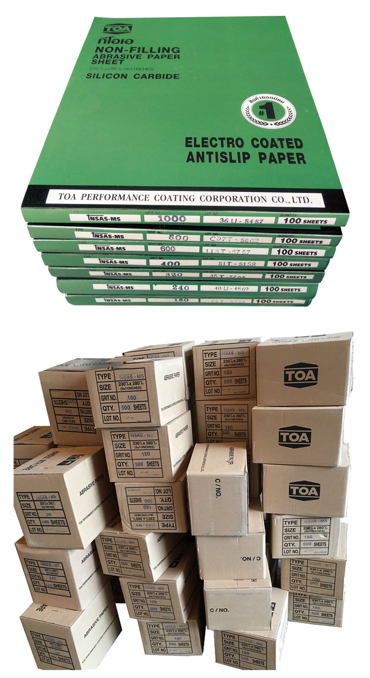| 泰国TOA牌砂布 | 230*280 | 氧化铝 | 纸基 | 120#-1000# | 1000张/箱 |