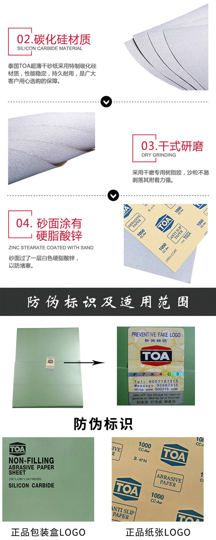干砂纸的特点:纸身过胶,柔软坚韧;采用静电值砂,令砂粒分布均匀;采用碳化硅,砂面锋利,磨擦力强;采用干磨专用树脂胶,砂粒不易剥落,其附着力强。砂面过了一层白色硬脂酸锌,以防堵塞。