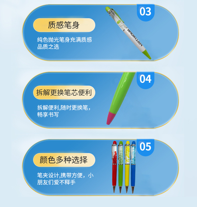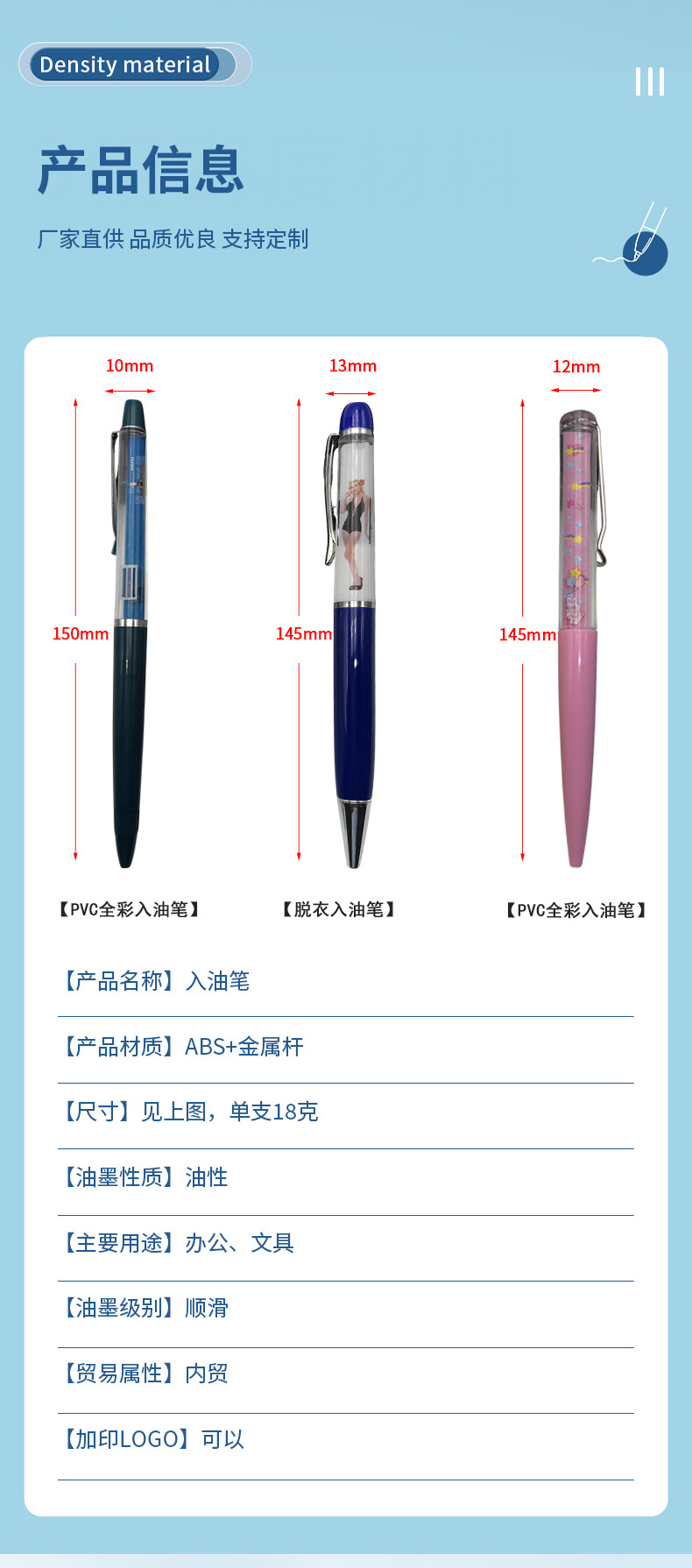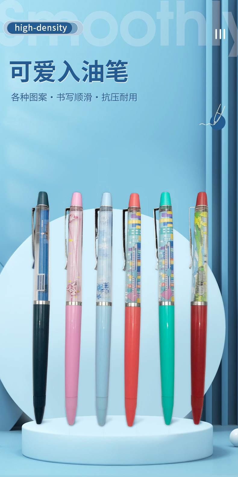 メーカーはプラスチック製の油入りボールペンを供給しており、浮遊物入りの油入りペンはロゴを印刷して必要に応じて生産できます。