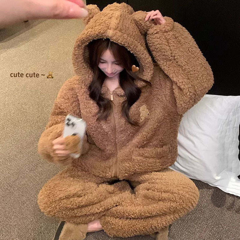 珊瑚绒睡衣女款秋冬季加厚加绒可爱法兰绒家居服冬天学生保暖套装
