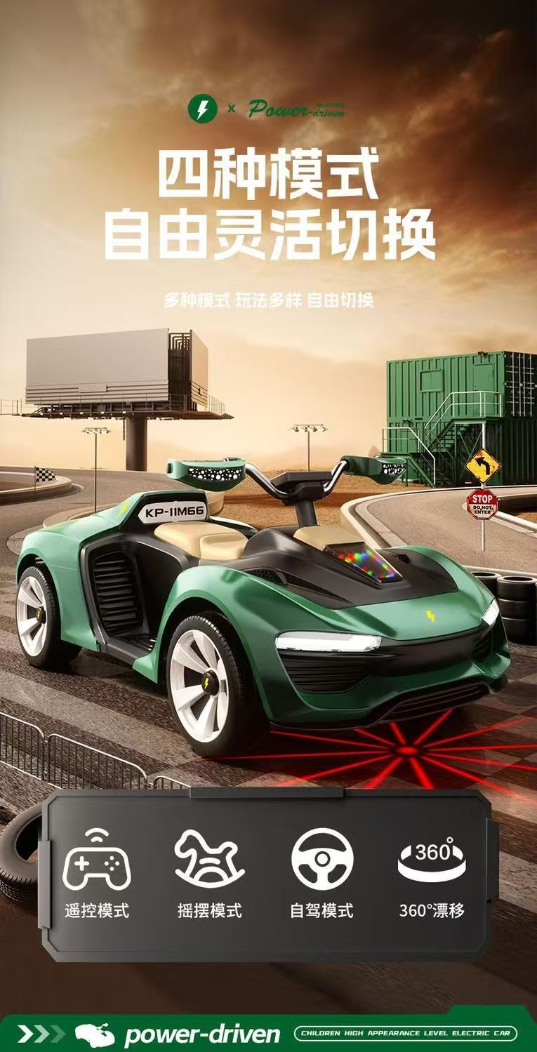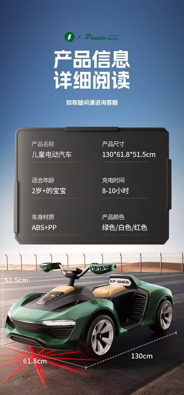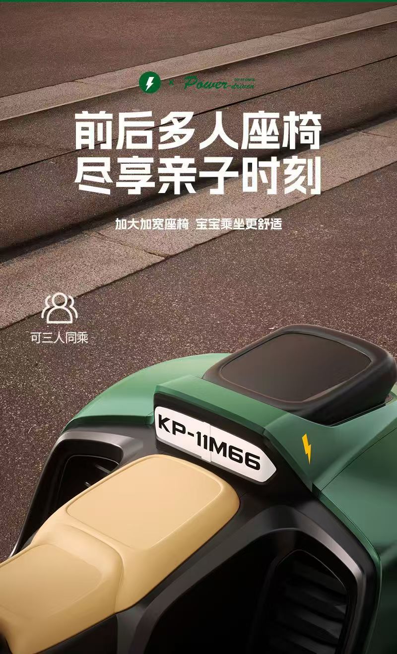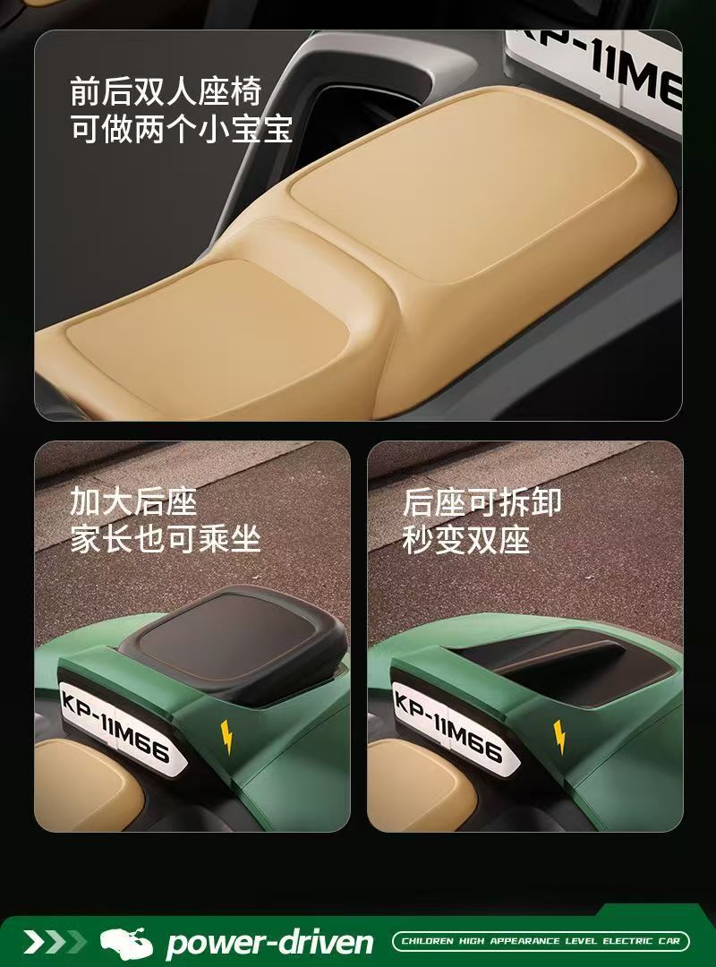APP三种操控模式,带电子摇摆功能,双人座椅(可加配三人座椅),加大加宽油门踏板,车身酷炫LED灯光,12V7超大电瓶,380*2电机,2.4G蓝牙遥控器,智能中控集成音乐板,可插U盘,外接蓝牙