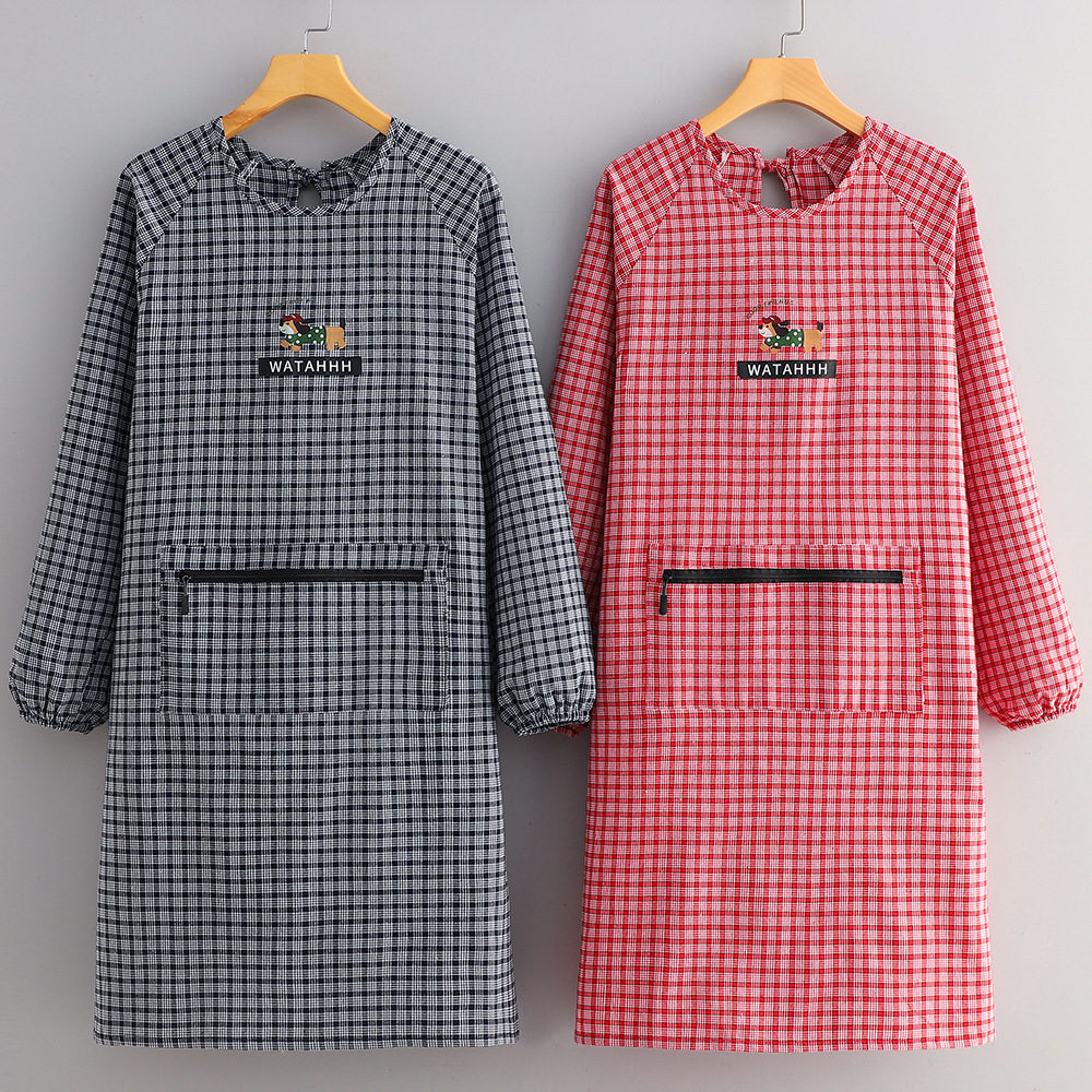 长袖棉格围裙上班耐脏厨房反穿大兜罩衣家用做饭防污干活工作服