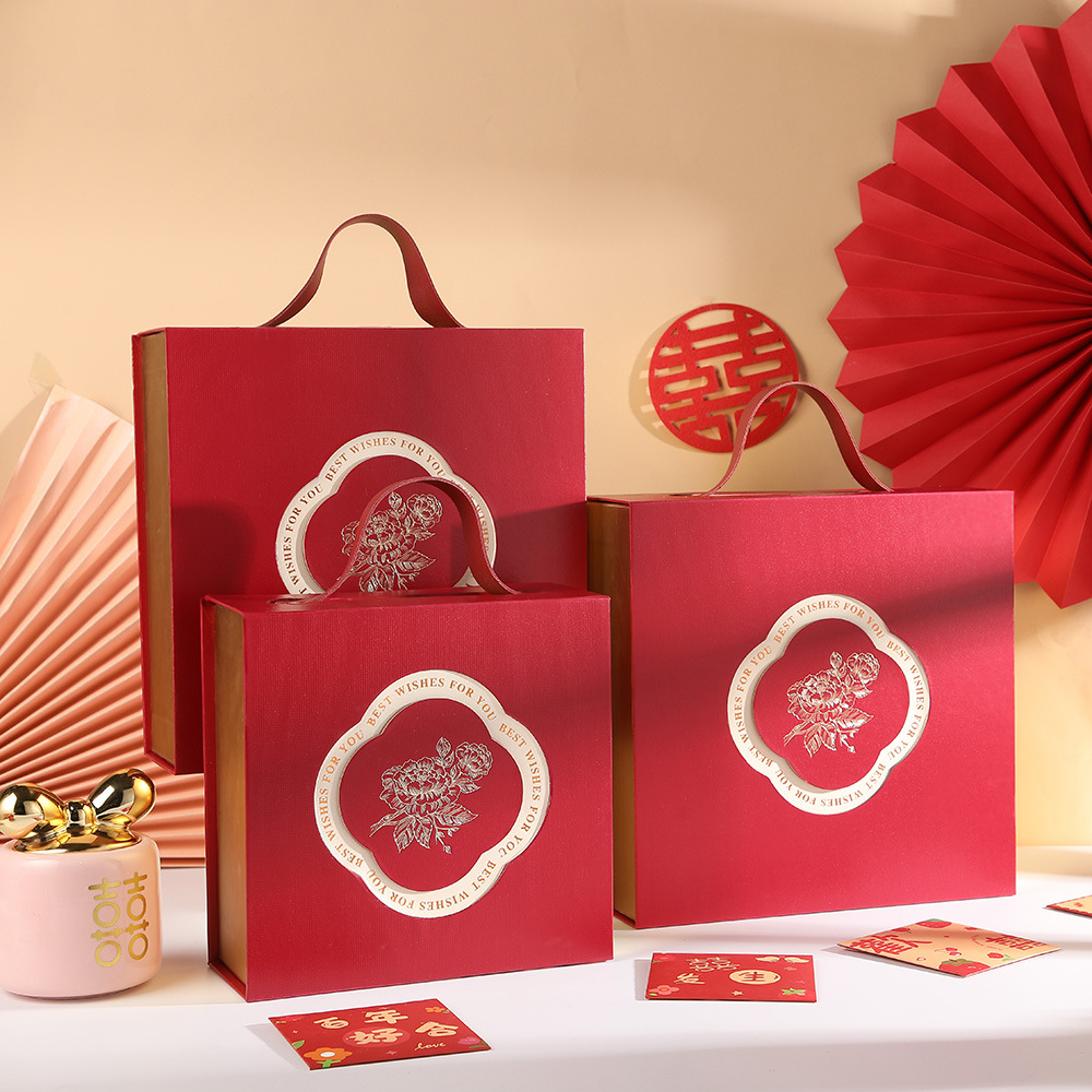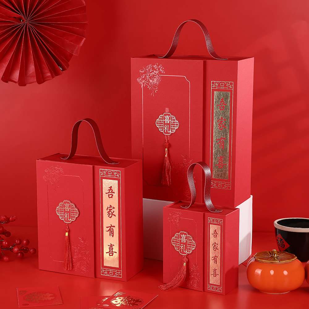 新しい人気の天地蓋喜礼喜糖箱中国式赤いお祝い結婚祝いプレゼント包装箱手提げ袋付き