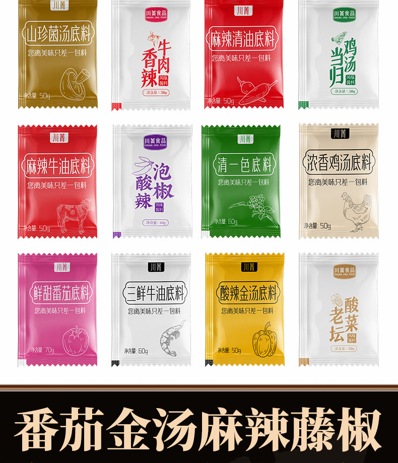 パッケージ仕様 麻辣牛油マッシュポテト調味料50g/袋,麻辣清油マッシュポテト調味料50g/袋,スパイシー牛肉風味マッシュポテト調味料50g/袋,老壇酸っぱい料理風味マッシュポテト調味料50g/袋,酸っぱいピーマン風味マッシュポテト調味料50g/袋,酸っぱい金スープマッシュポテト調味料50g/袋,新鮮で甘いトマトのマッシュポテトの調味料70g/袋,藤椒清一色マッシュポテト調味料60g/袋,山珍菌スープマッシュポテト調味料50g/袋,三鮮マッシュポテト調味料60g/袋,濃厚な香りの鶏のスープのジャガイモの粉の調味料の50g/袋,濃縮スープ30g/袋