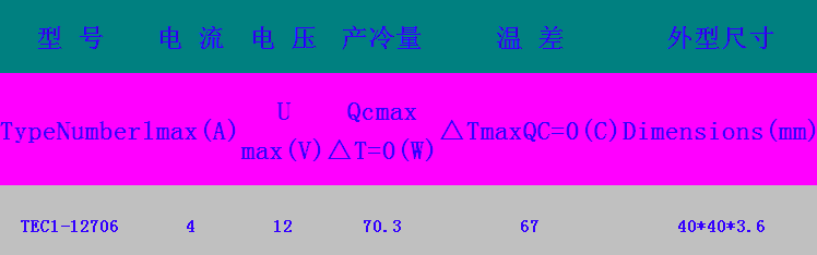 额定电压为:12v, 额定电流为4.5A,大概是50--60W,温差可达60摄氏度,外型尺寸为4 X 4 X 0.4Cm,重约25克。它的工作特点是一面制冷而一面发热。