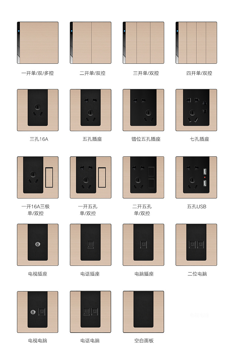 5穴のソケット (二、三本),位置ずれ五穴 (斜め五穴),シングルコントロール,ダブルコントロール,一発マルチコントロール,二開きシングルコントロール,二開きダブルコントロール,二開多控,三開きシングルコントロール,三開きダブルコントロール,四開きシングルコントロール,四開きダブルコントロール,16a 3穴 (エアコンコンセント),16aの穴を開けると,穴をあけて単制御する,穴をあけるとダブルコントロールします。,二開五穴ダブルコントロール,7穴ソケット,5穴ダブルusbソケット,ブランクパネル (ホワイトボード),テレビのコンセント,電話ソケット,コンピュータのネットワークケーブルのコンセント,テレビのコンセント,電話コンピュータソケット,パソコン用コンセント,速度調整スイッチ,調光スイッチ,音響光制御遅延スイッチ,タッチ遅延スイッチ,人体誘導スイッチ,非常押しボタンスイッチ,人体感応フットライト,任意のカードを挿入して 40A の電力を供給します,低周波プラグインカードは 40A を消費します,高周波プラグインカードは40Aの電力を消費します,86二位連体輪,86三位連体輪,86四位連体輪,118二位十穴 (元の6穴),118三位十五穴 (元の9穴),118四位二十穴 (元の12穴),118四位十五穴スイッチ付き,118四位十五穴パソコンケーブル付き,118四位十穴テレビ付きパソコン,無色透明防水ボックス,伸線金防水ケース,金色のゆっくりと五穴を開けて挿します。