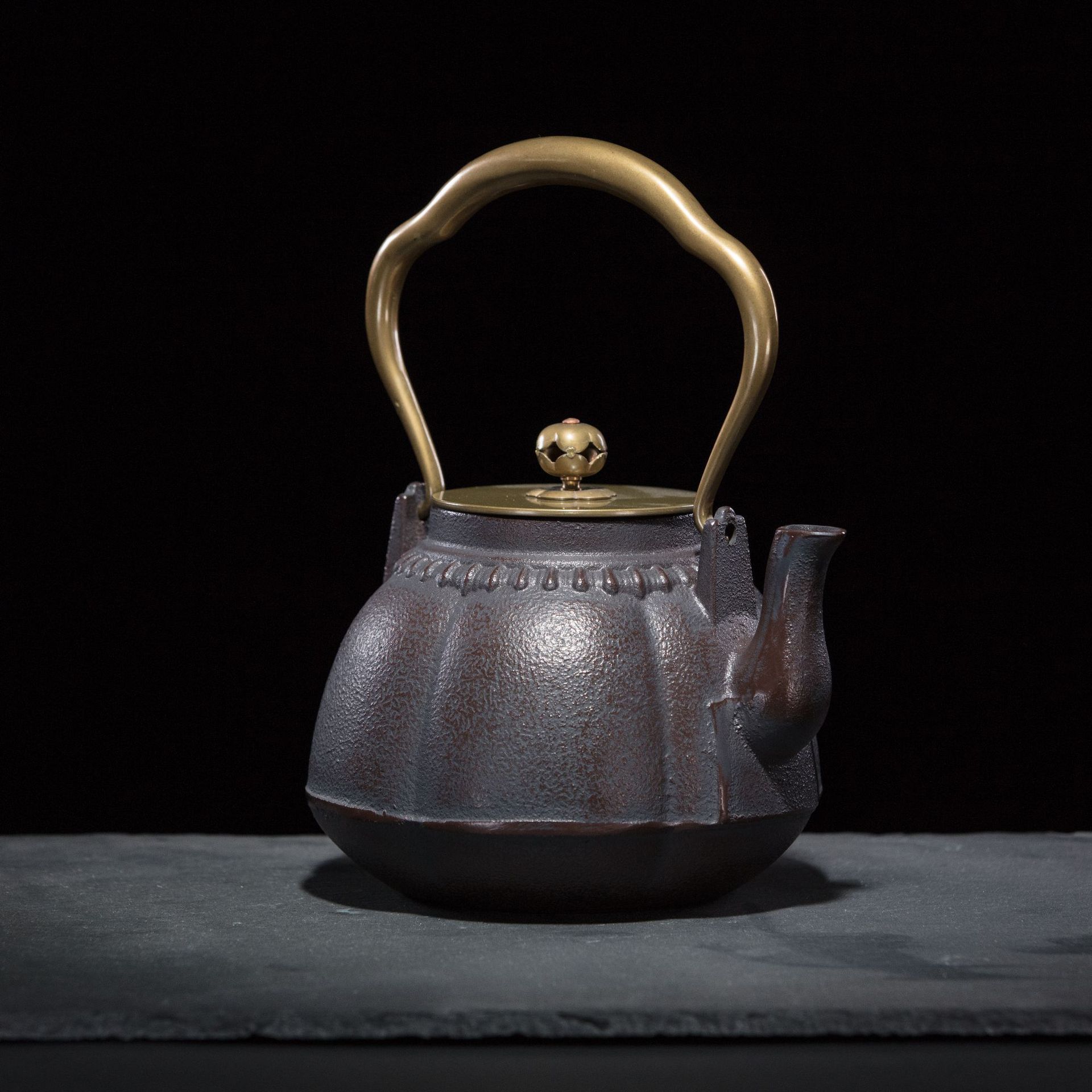 古風な色の炉火で煎じるお茶、レトロな持ち手付き鋳鉄製の水差し、功夫茶用の湯沸かしやお茶を入れる鉄製の水差し、中国風の装飾が施された鉄製の水差し