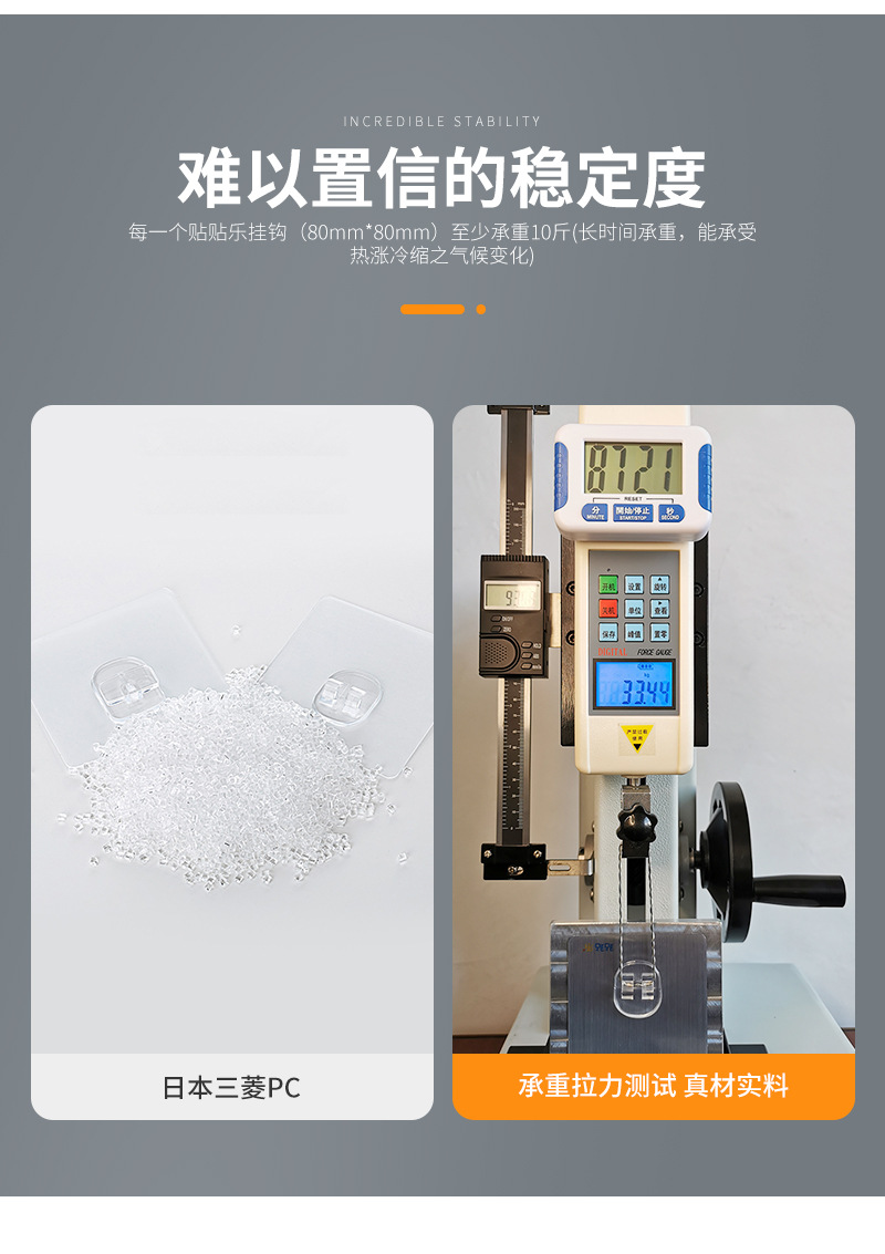 4、强承重:每一个贴贴乐挂钩(60mm*60mm)至少承重6斤(长时间承重,能承受热涨冷缩之气候变化);