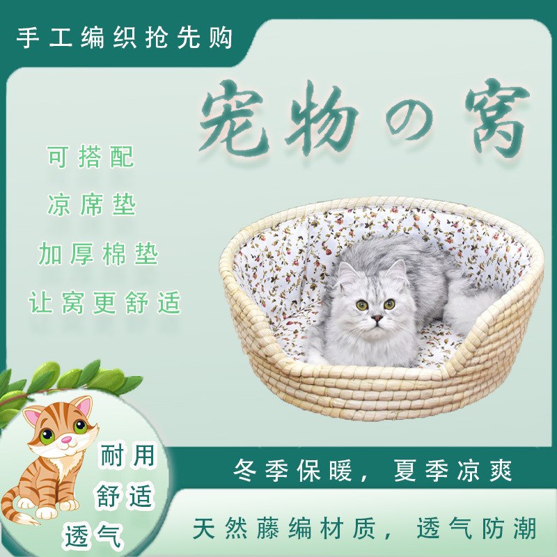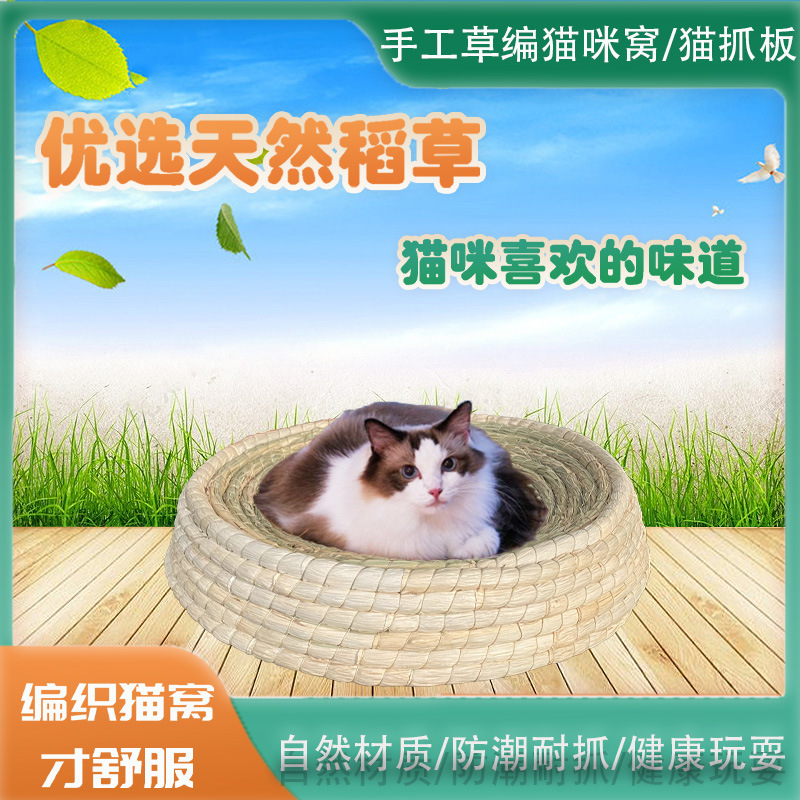 メーカーは手作りの草編みの猫の巣を提供しています。