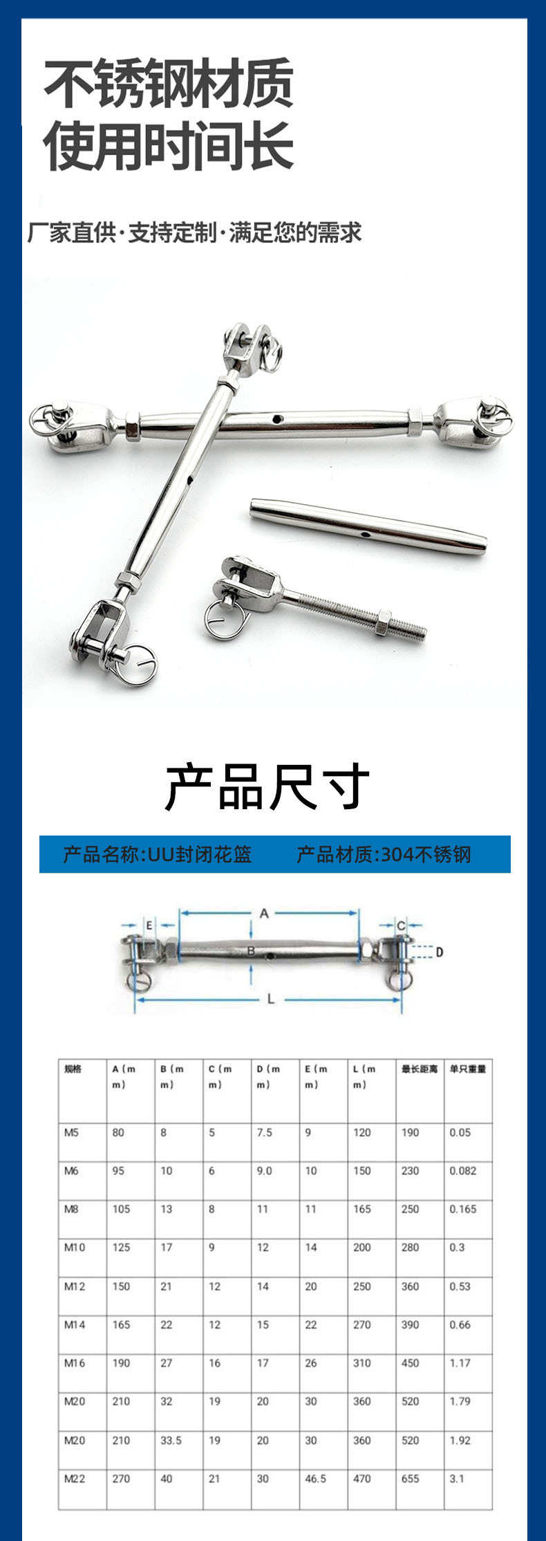 304不锈钢花篮螺丝闭体花兰螺栓 钢丝拉紧器链条收紧器M5M6M8M10