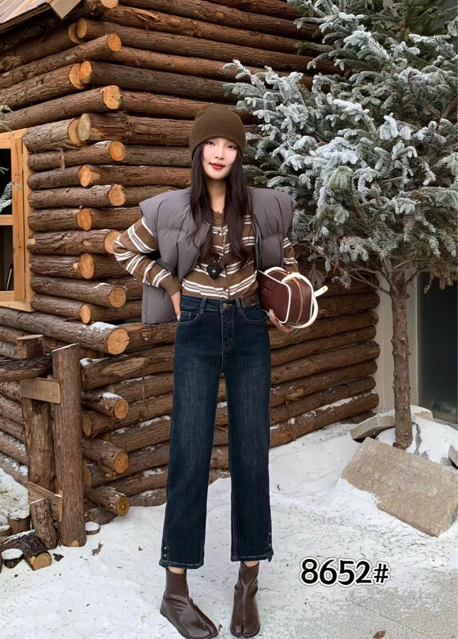 8652冬季新款加厚植绒高弹水洗软牛仔气质百搭显瘦九分烟管裤