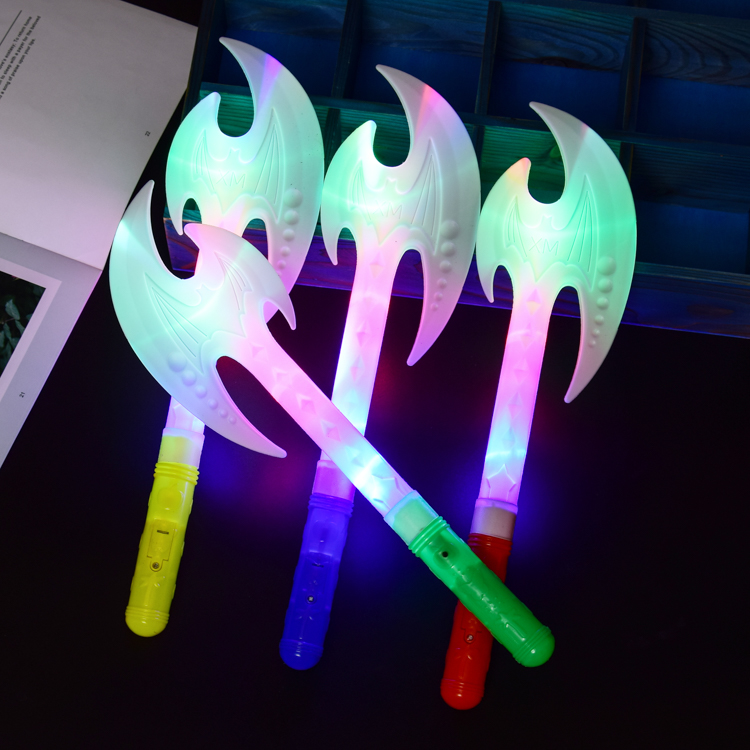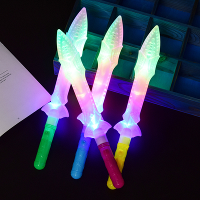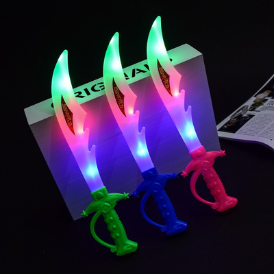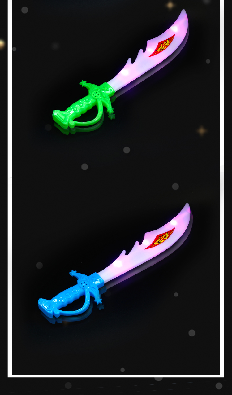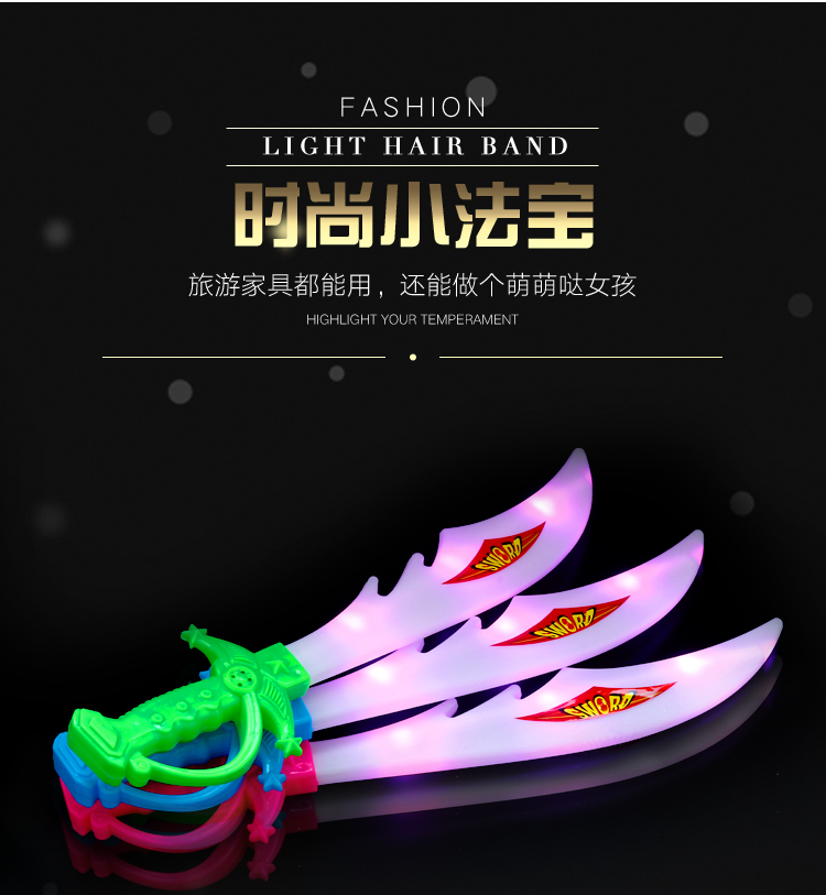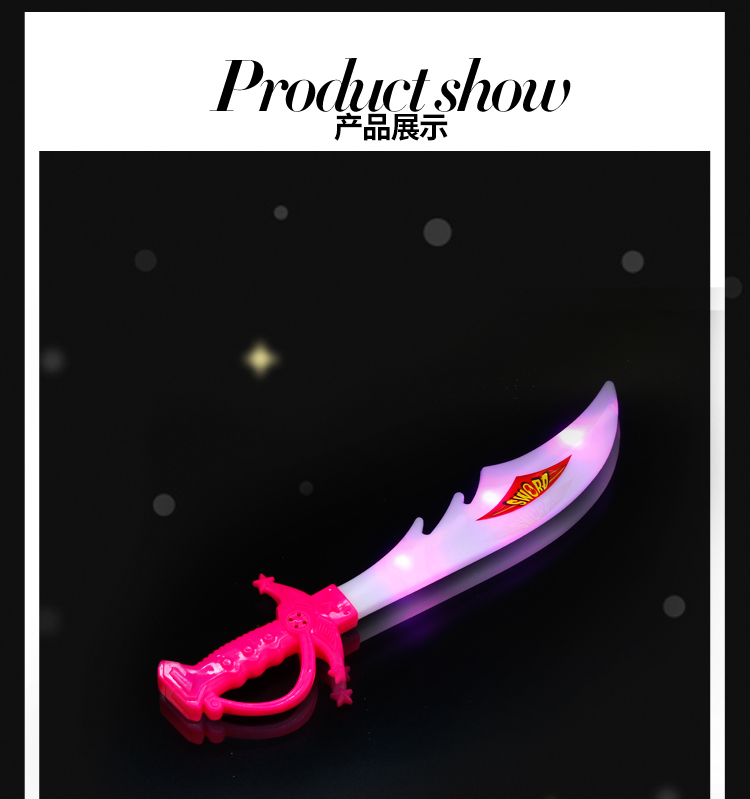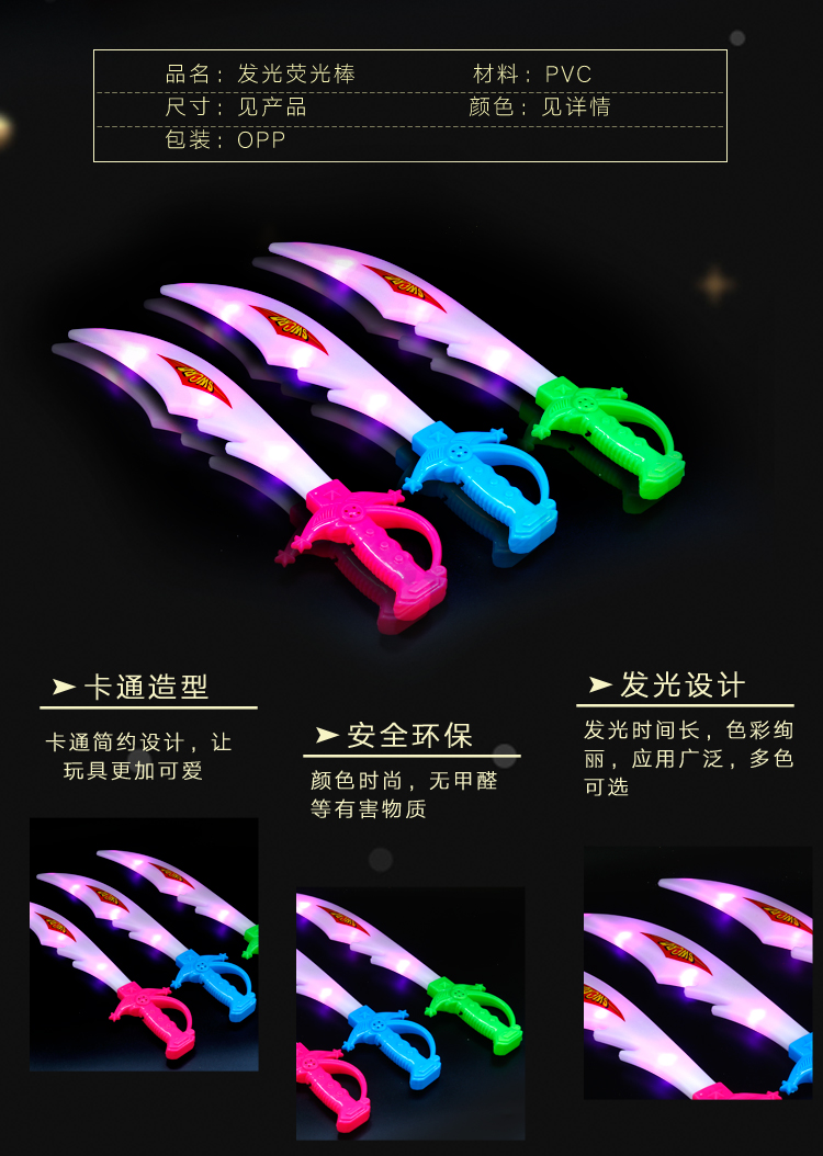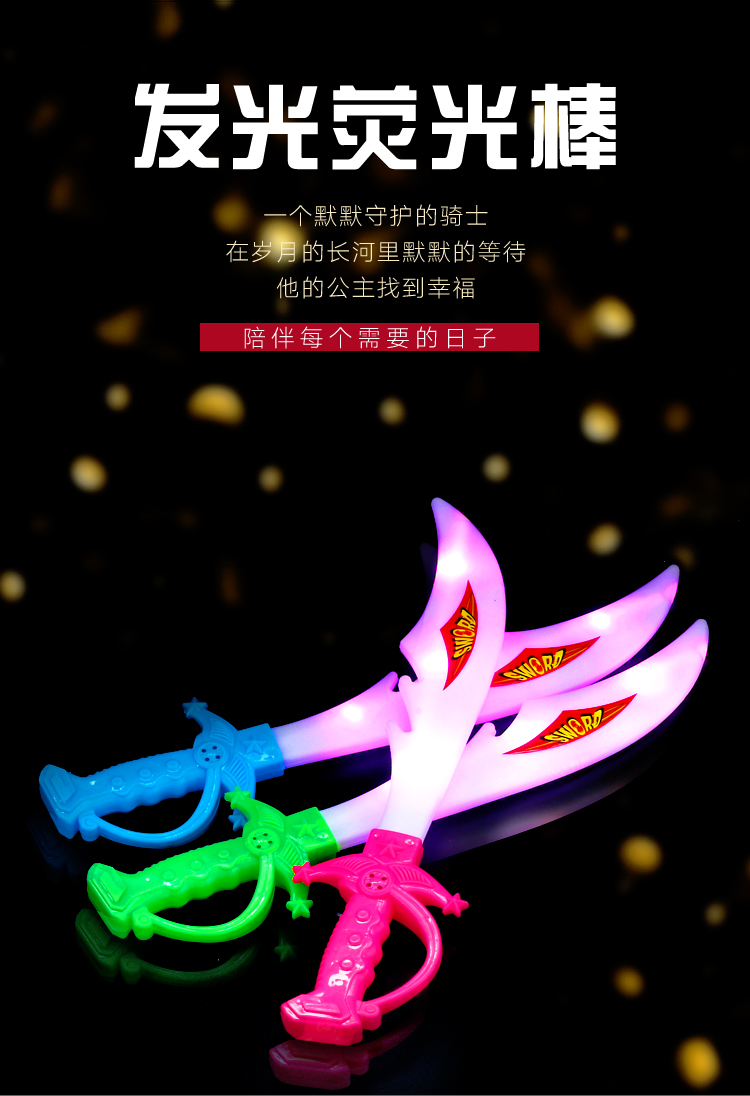颜产品介绍:在长刀的手柄处,装入3个AG13电子(自带),打开开关,大刀的6颗高亮LED七彩灯光全部亮起,,发光效果好,如产品展示效果图,像在真正战斗的一样仿真效果好。是现小朋喜爱。此款产品投放市场以来,深得客人好评,畅销。适用于晚会、节日派对、舞台道具、文艺演出等活动,适合广场、夜市、公园、等场合出售。小本创业,抓准商机!