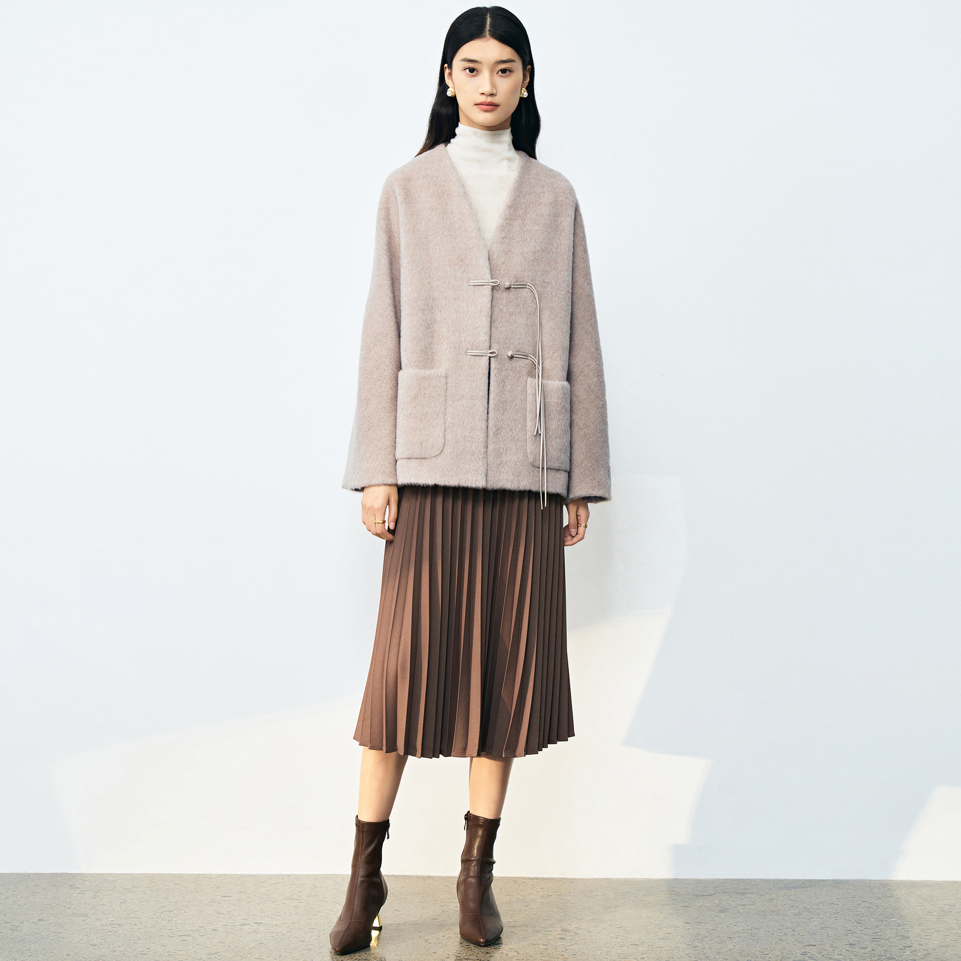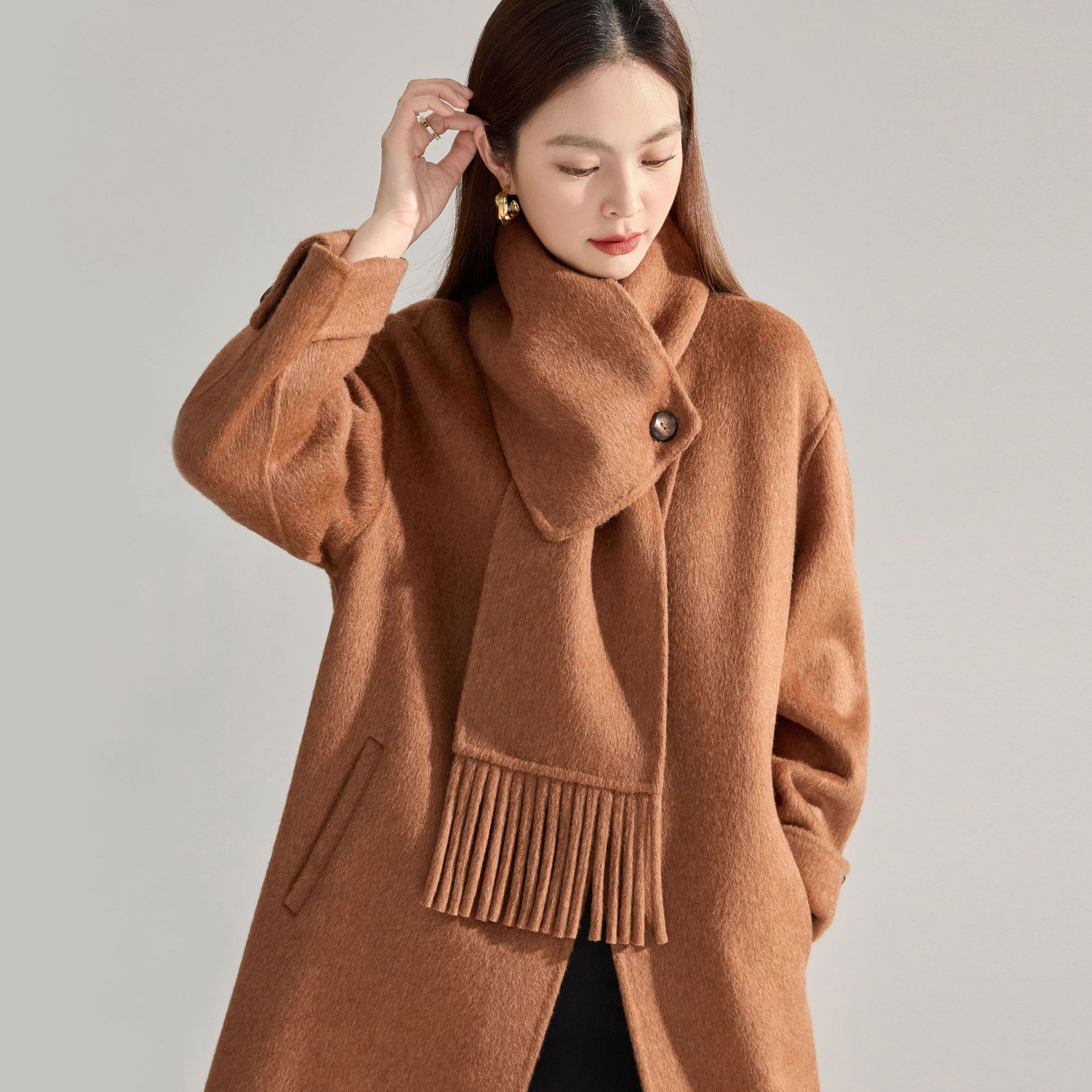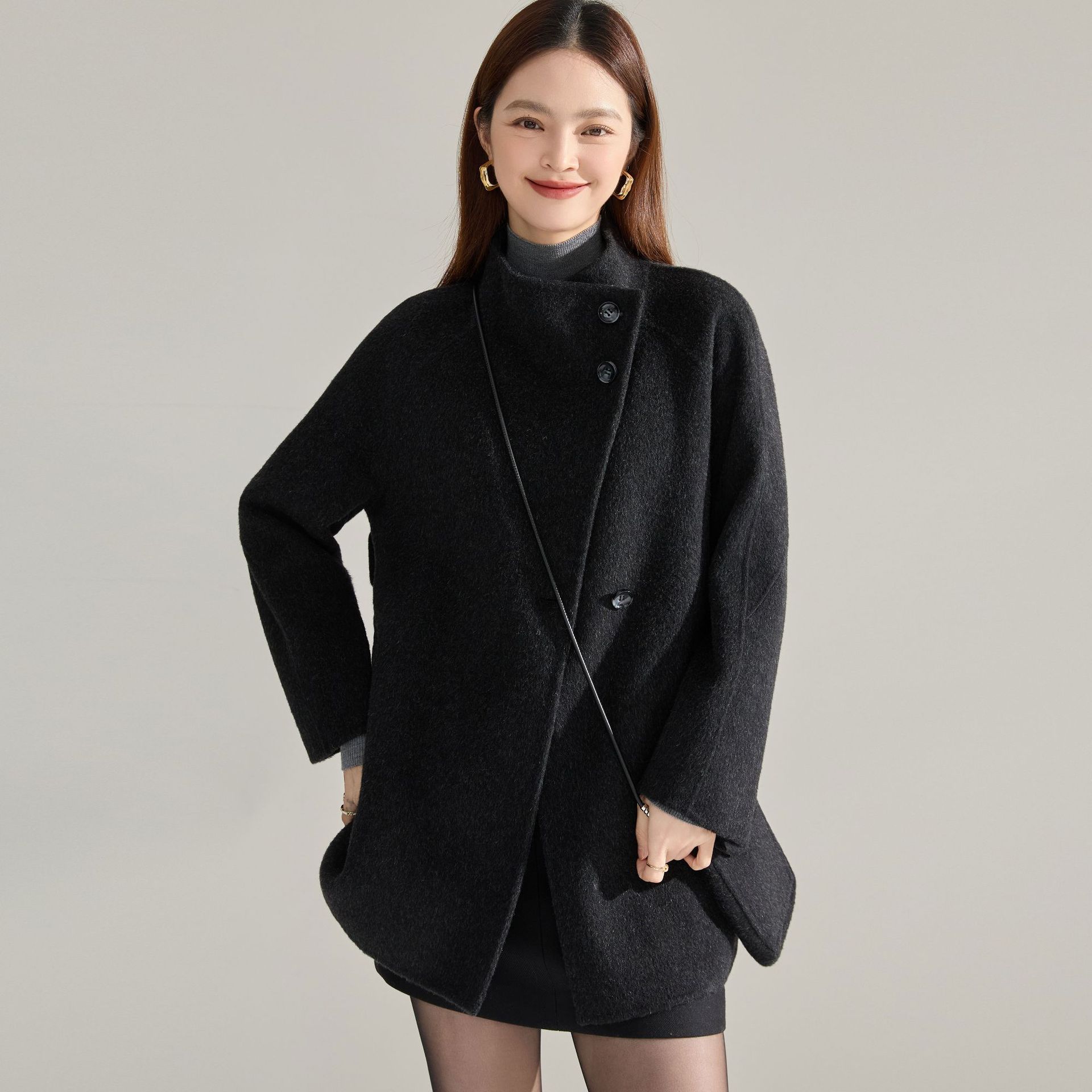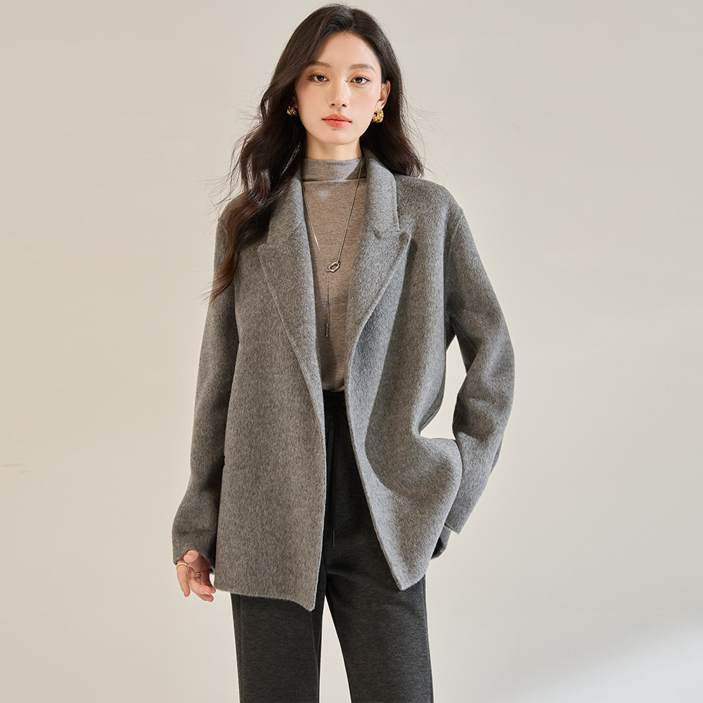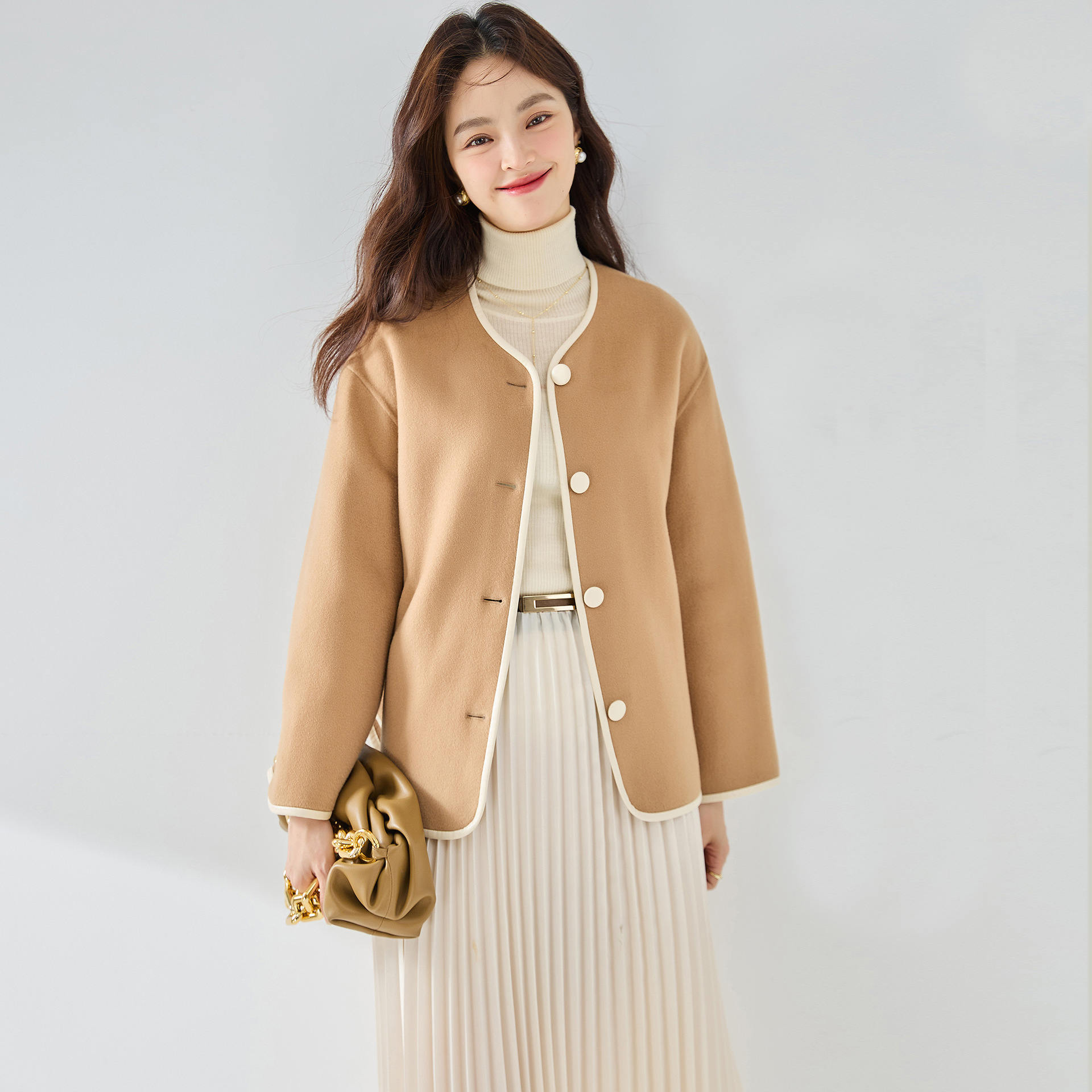 微茧廓形,适合大众体型,无领设计利落休闲,可搭配围巾精致温暖。中款衣长是任何身高都可以驾驭的,穿着无压力。