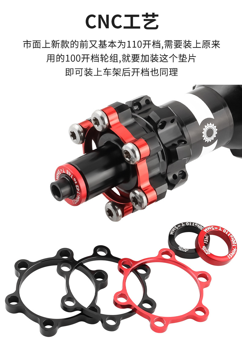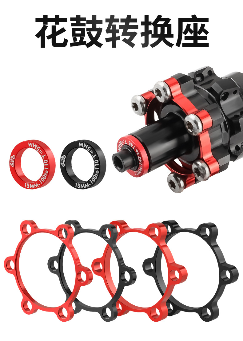 适用于前花鼓桶轴开档100mm转110mm,后花鼓桶轴142转148mm,以适应相对应的碟刹盘位置和开档的需求,解决了花鼓与前叉、车架兼容性的问题