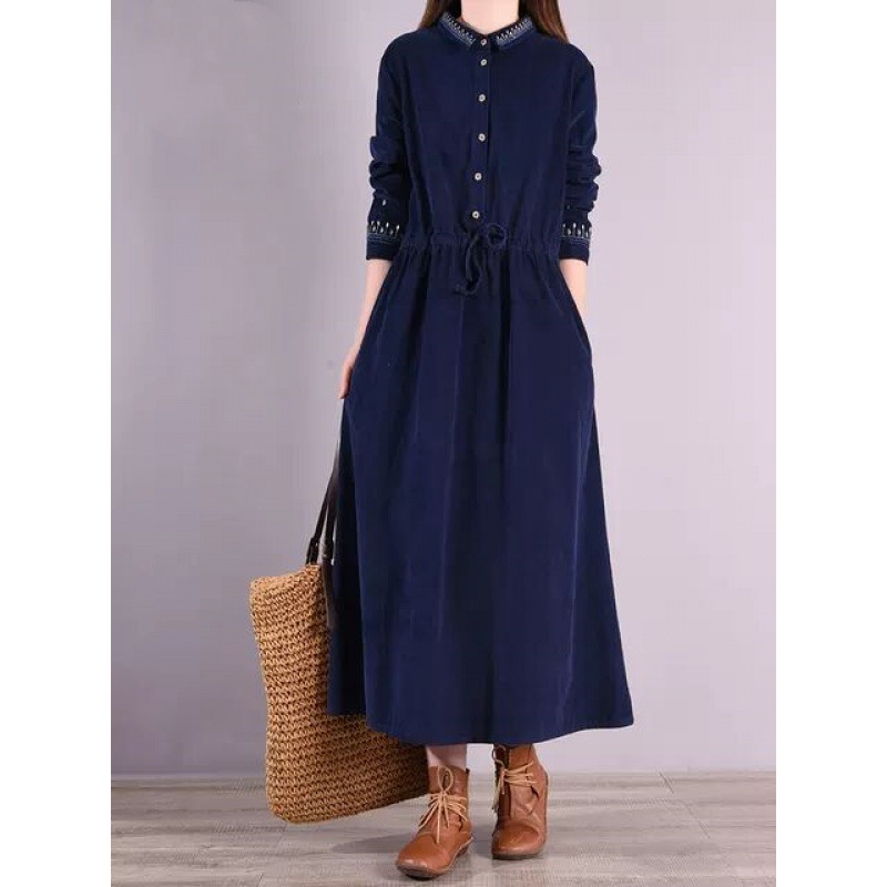 2025年秋新作、ゆったりとした大きいサイズの女性用刺繍入り紐付きウエストマークミディ丈コーデュロイワンピース(海外実物撮影)