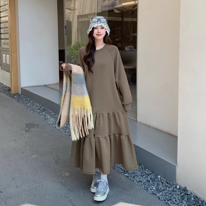 2026春季文艺宽松大码女装圆领长袖荷叶边裙摆过膝鱼尾卫衣连衣裙