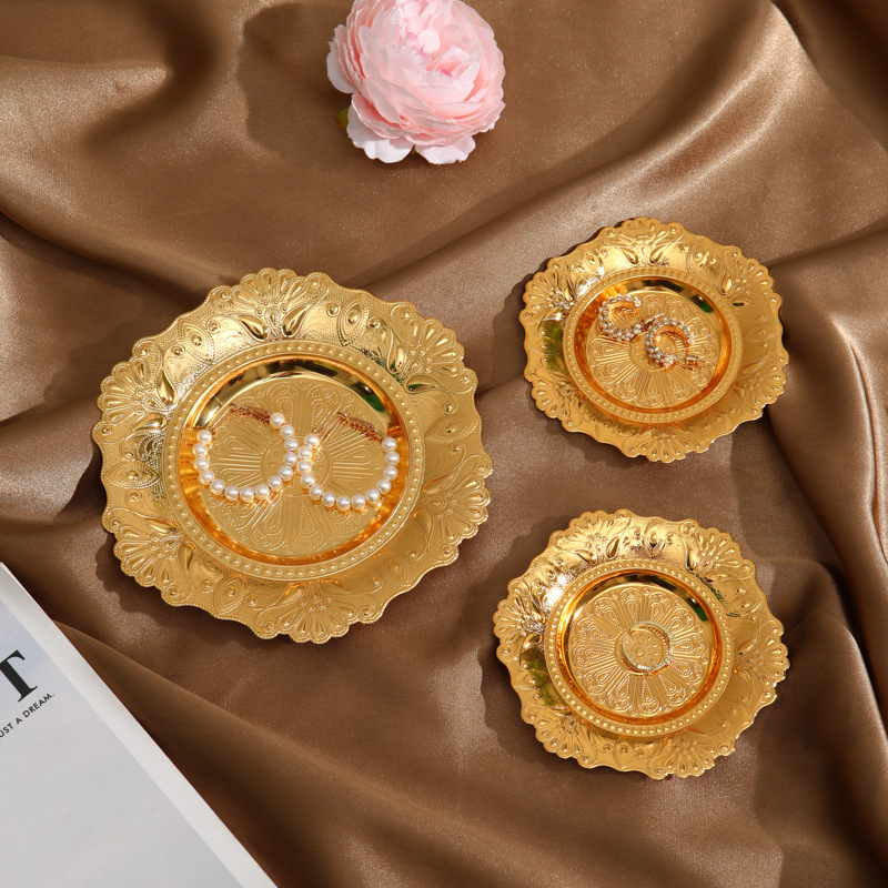 鉄製の金色のレリーフの小さいトレーの果物のお菓子のケーキの皿の装飾の皿のお茶の杯のアクセサリーの収納の皿のデザートの台
