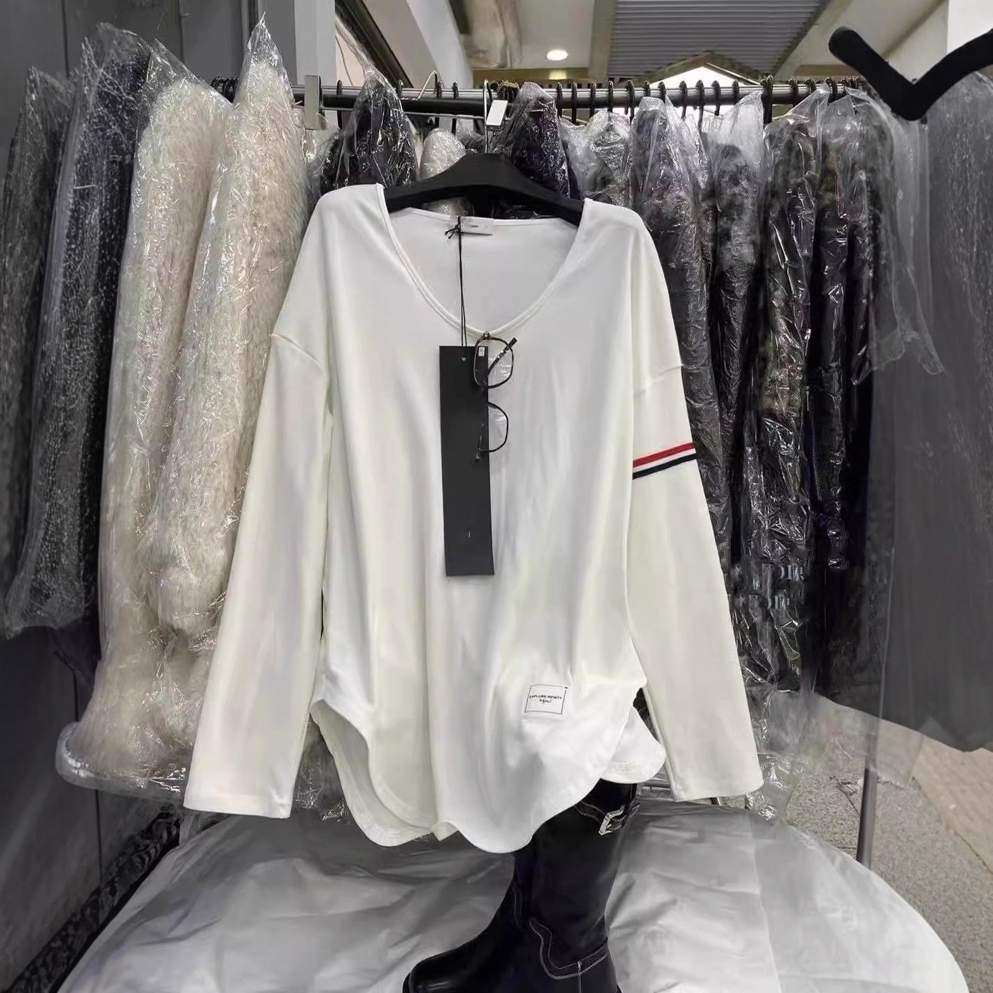大码U领设计感杠条贴标宽松撞色打底衫长袖T恤女2025秋冬新款上衣